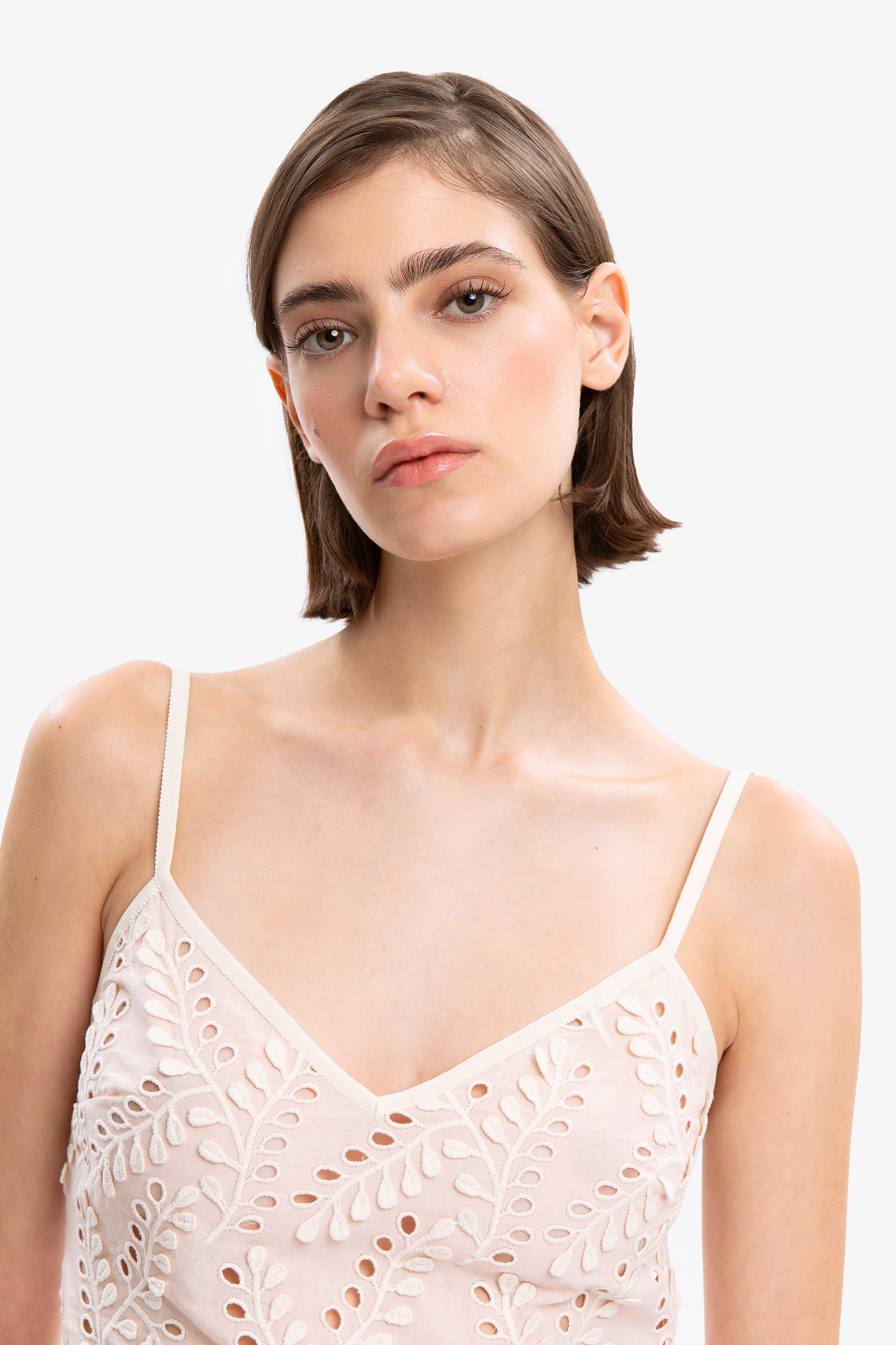 Kisses from Saint Tropez. Cotton top embroidered with an interplay of reliefs and fretwork. Thin shoulder strap, deep neckline and scalloped hem. Pair it with LUCILLA shorts for a coordinated total look.