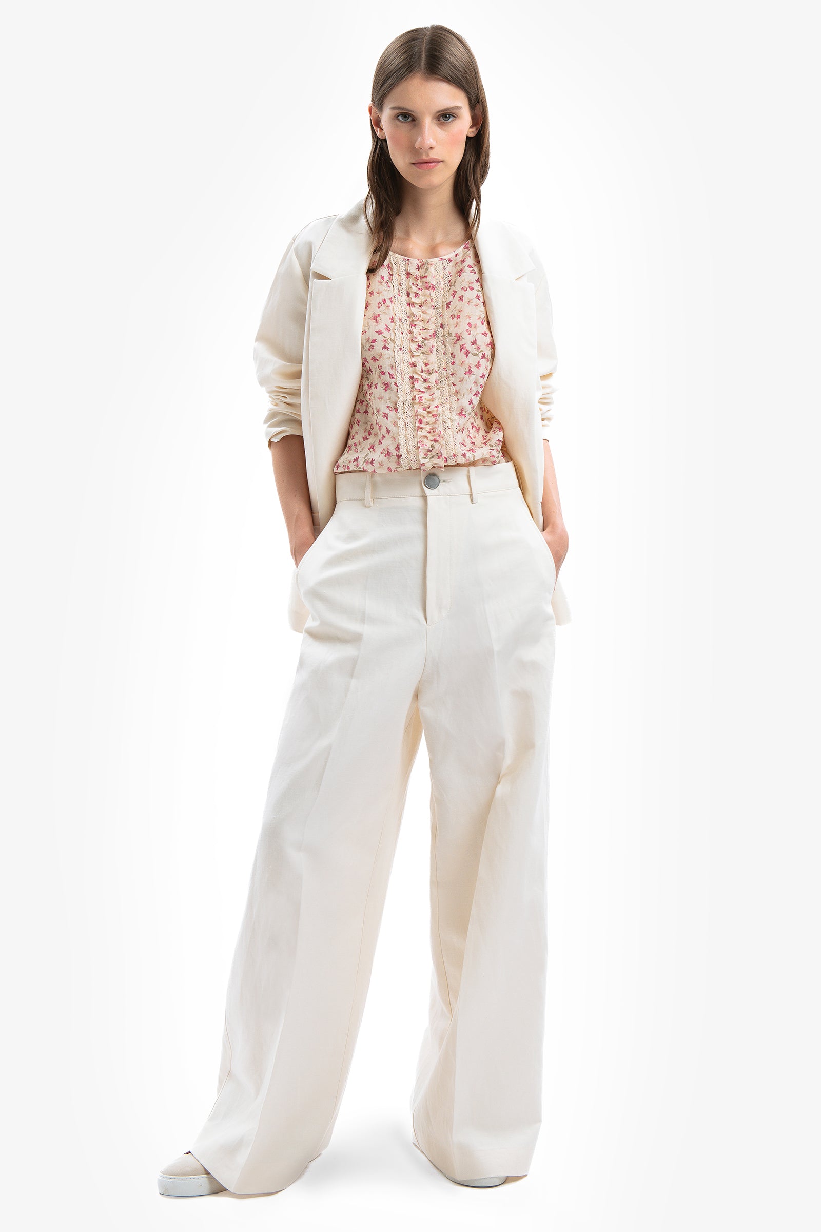 Cotton-linen drill trousers with a regular waist and belt loops. Wide-leg palazzo style, with side pockets and a zip and button closure.