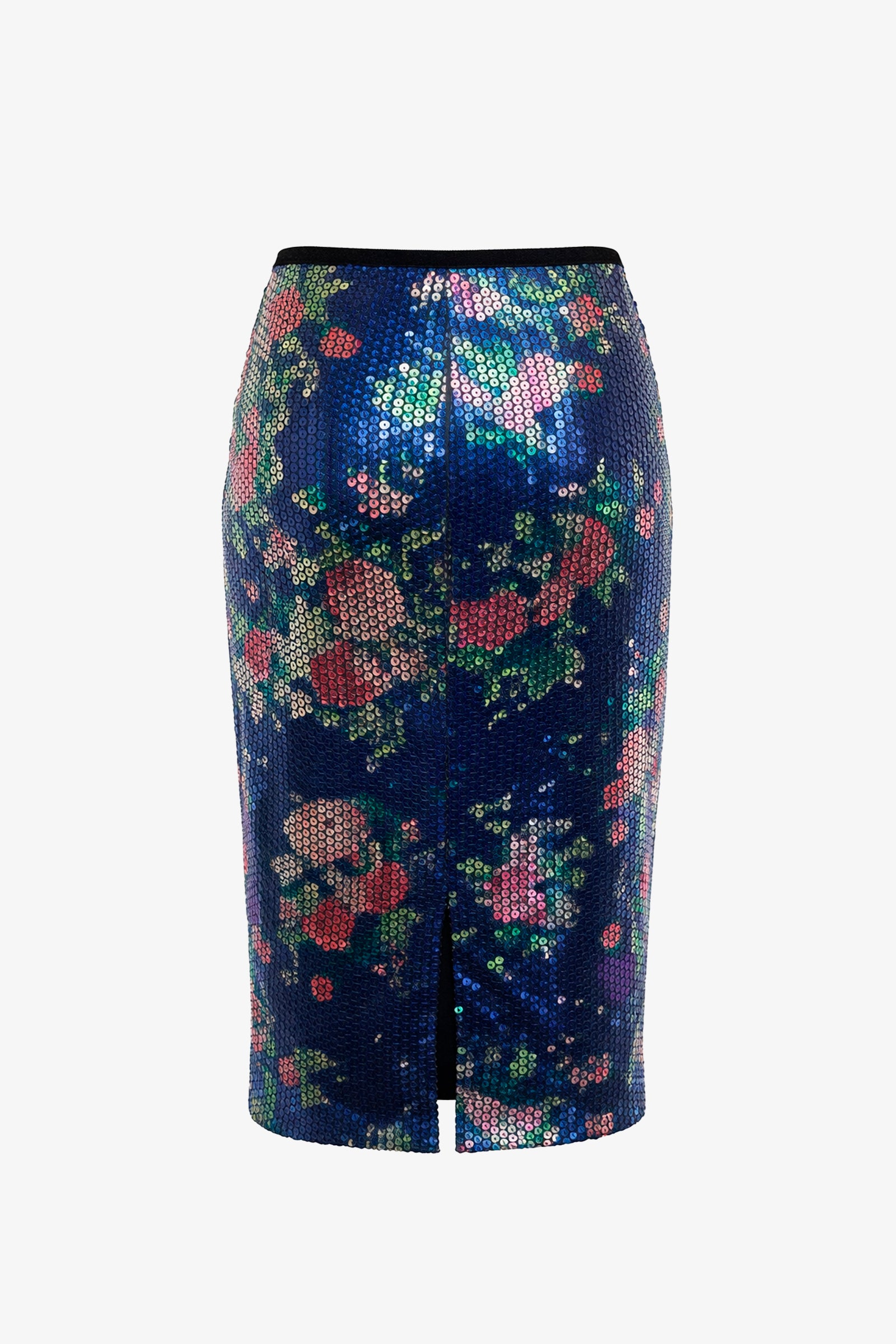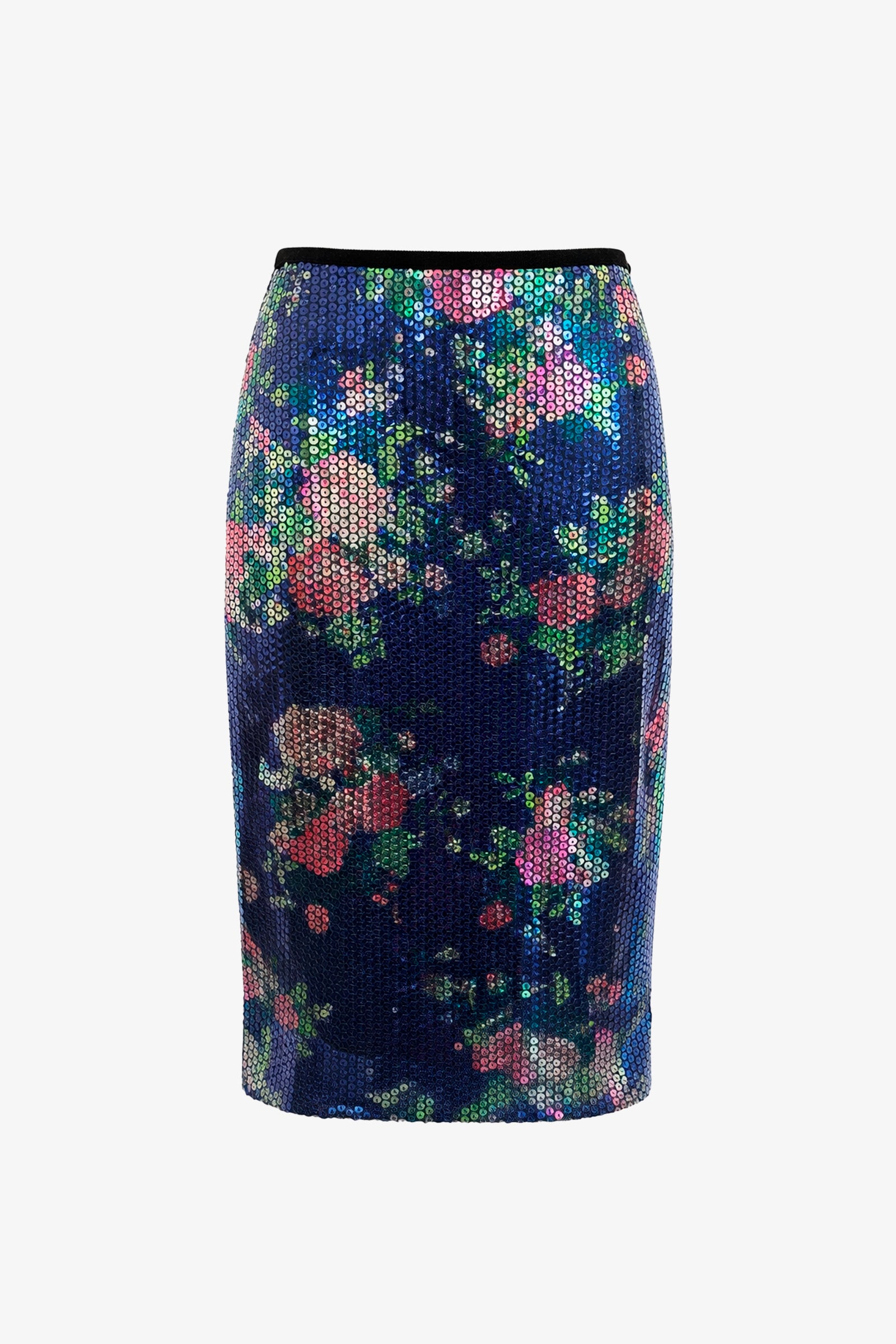 An invitation to experience the magic of unique occasions. Stretch midi skirt in floral sequins.