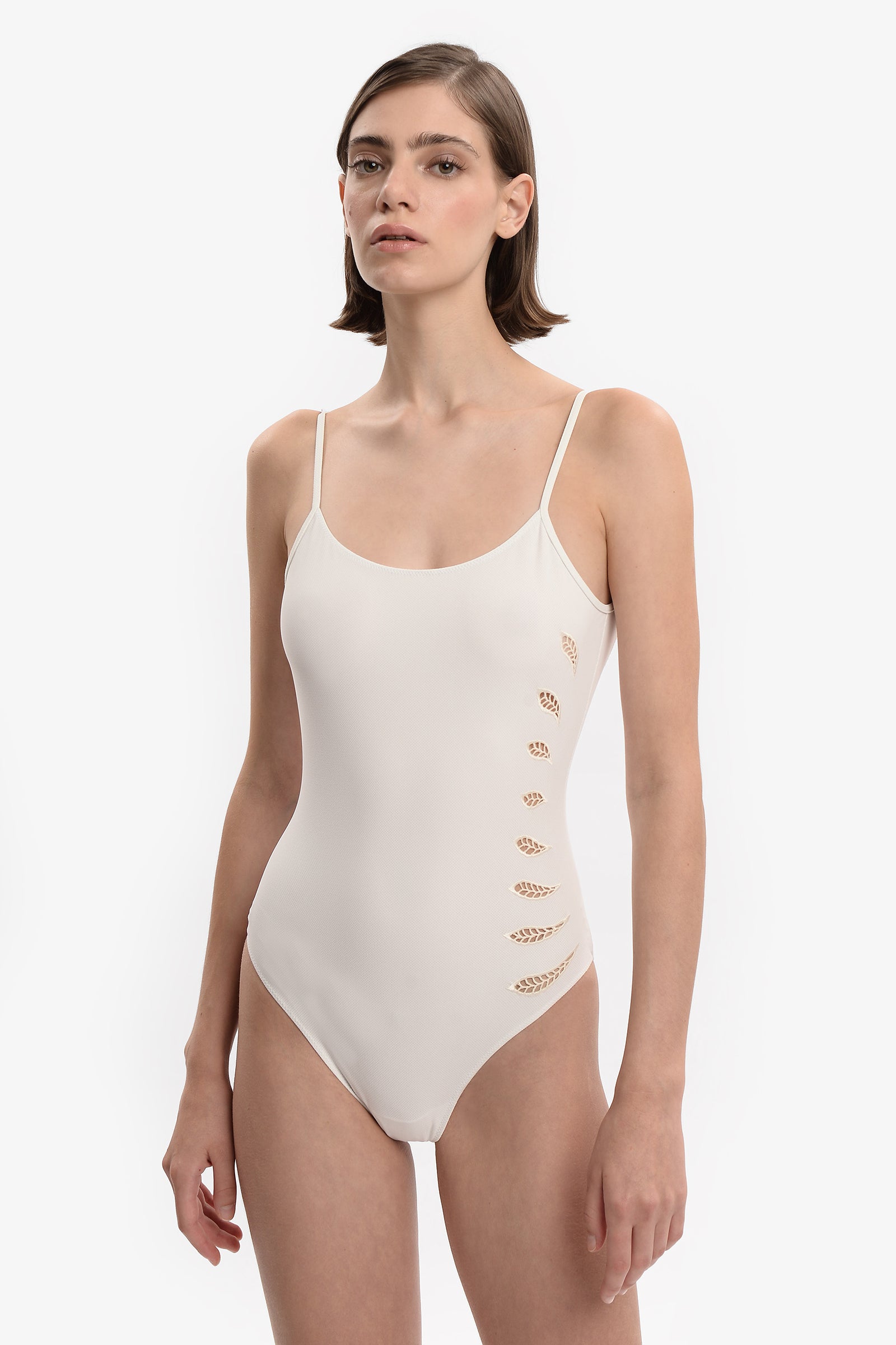 She loves me, she loves me not. One-piece swimsuit with ballerina neckline. Embroidered leaves with à jour stitch on the side for a sensual see-through effect on the skin.