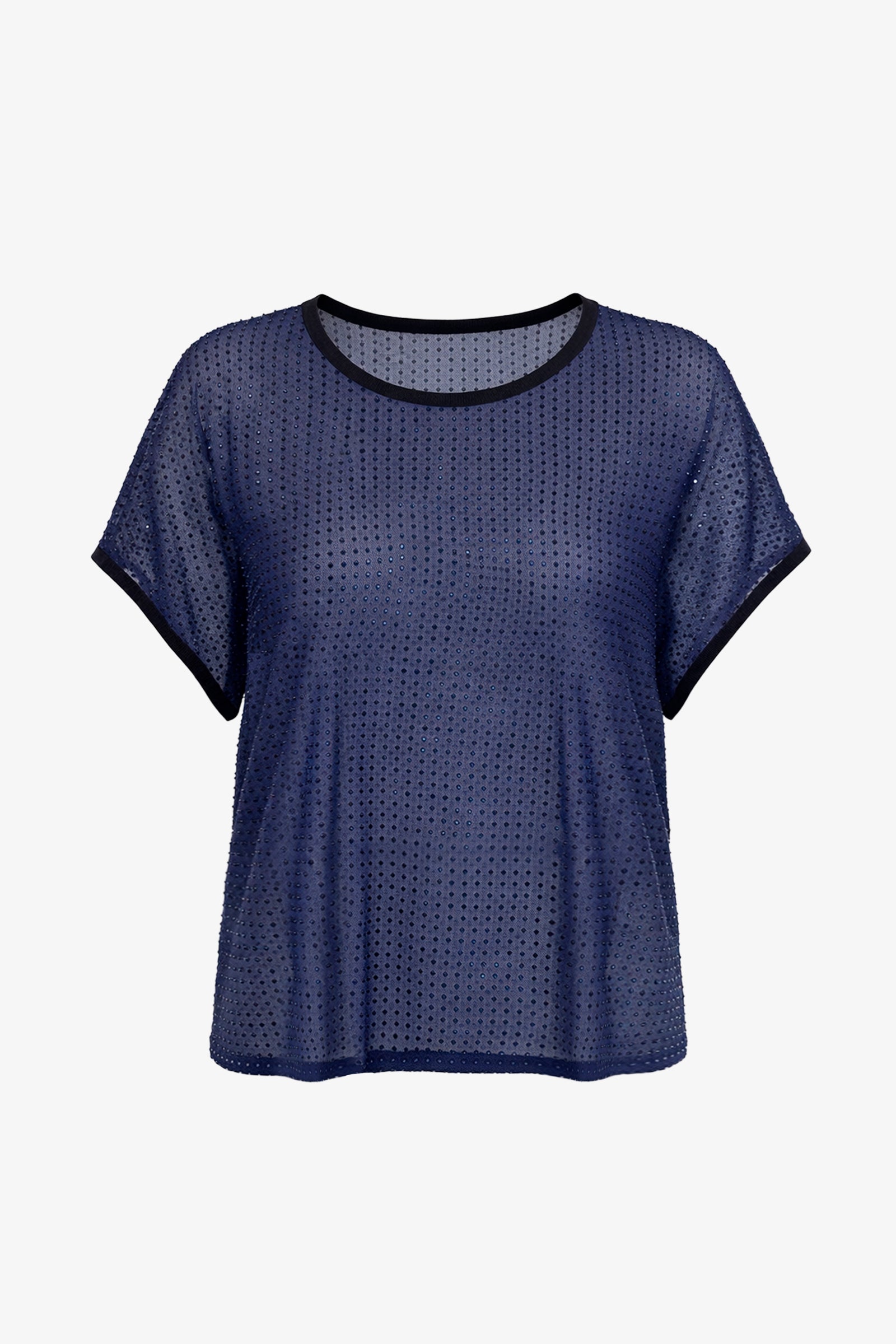 An invitation to experience the magic of unique occasions. Lightweight see-through tulle T-shirt with contrasting trim, accented with rhinestones.