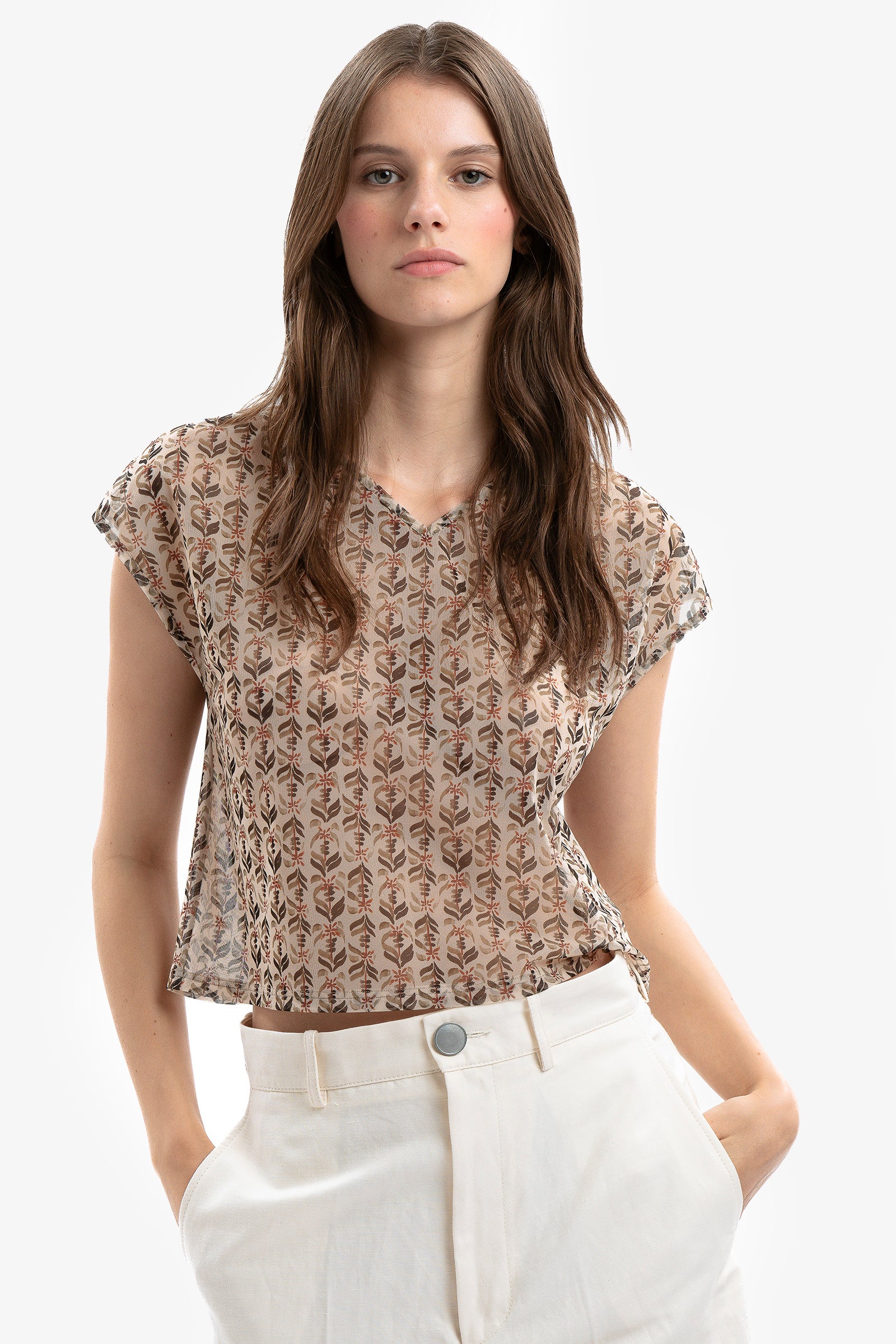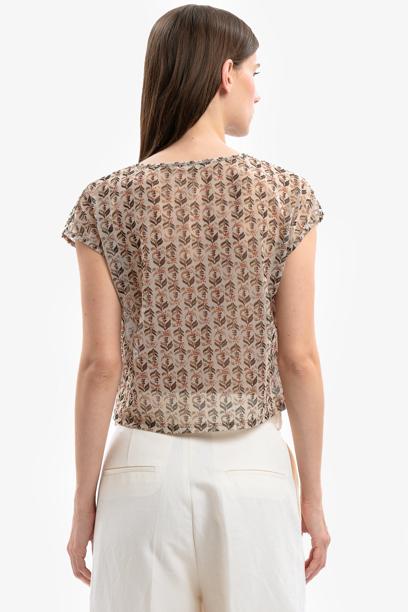 Stretch printed tulle sheer T-shirt with a V-neck and short sleeves.