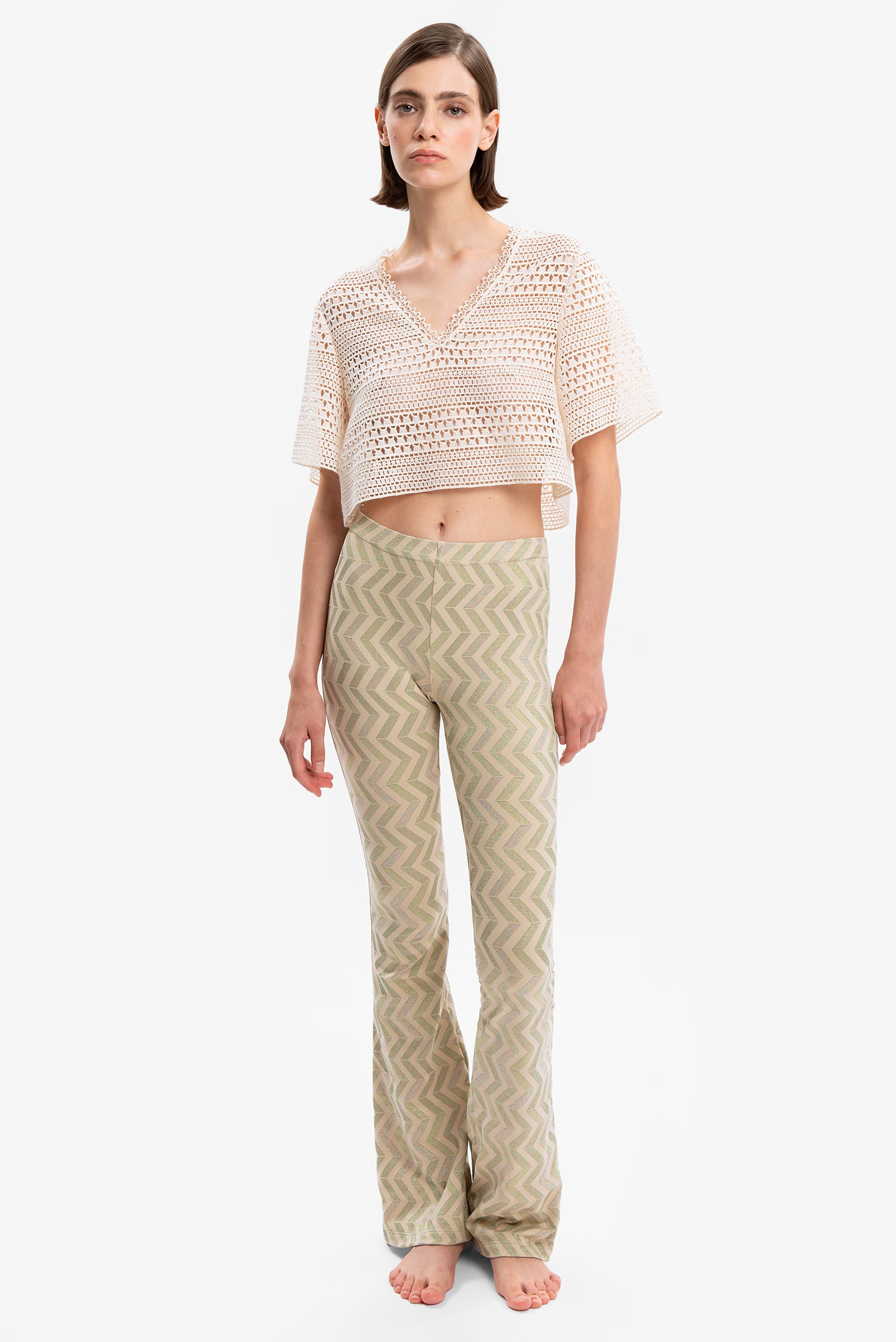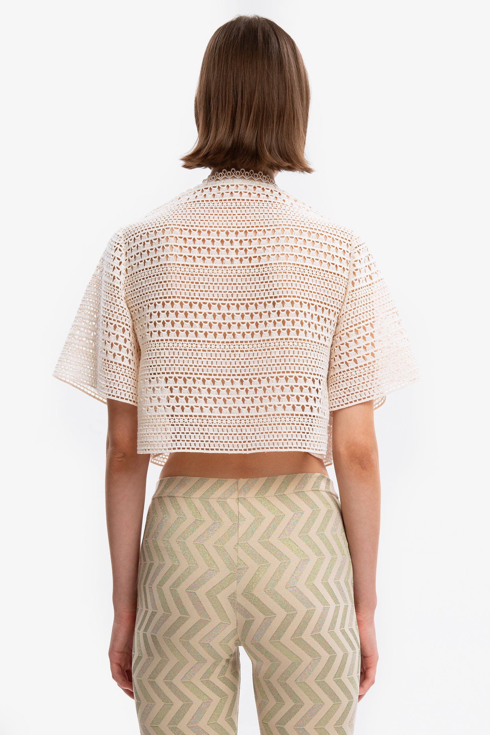 Of sun and sand. Cotton macramé crop top with V-neck framed by ton sur ton trimmings. Pair it with MATILDA pants for an intriguing look.