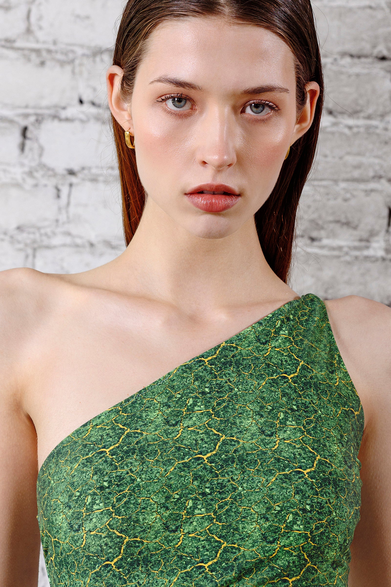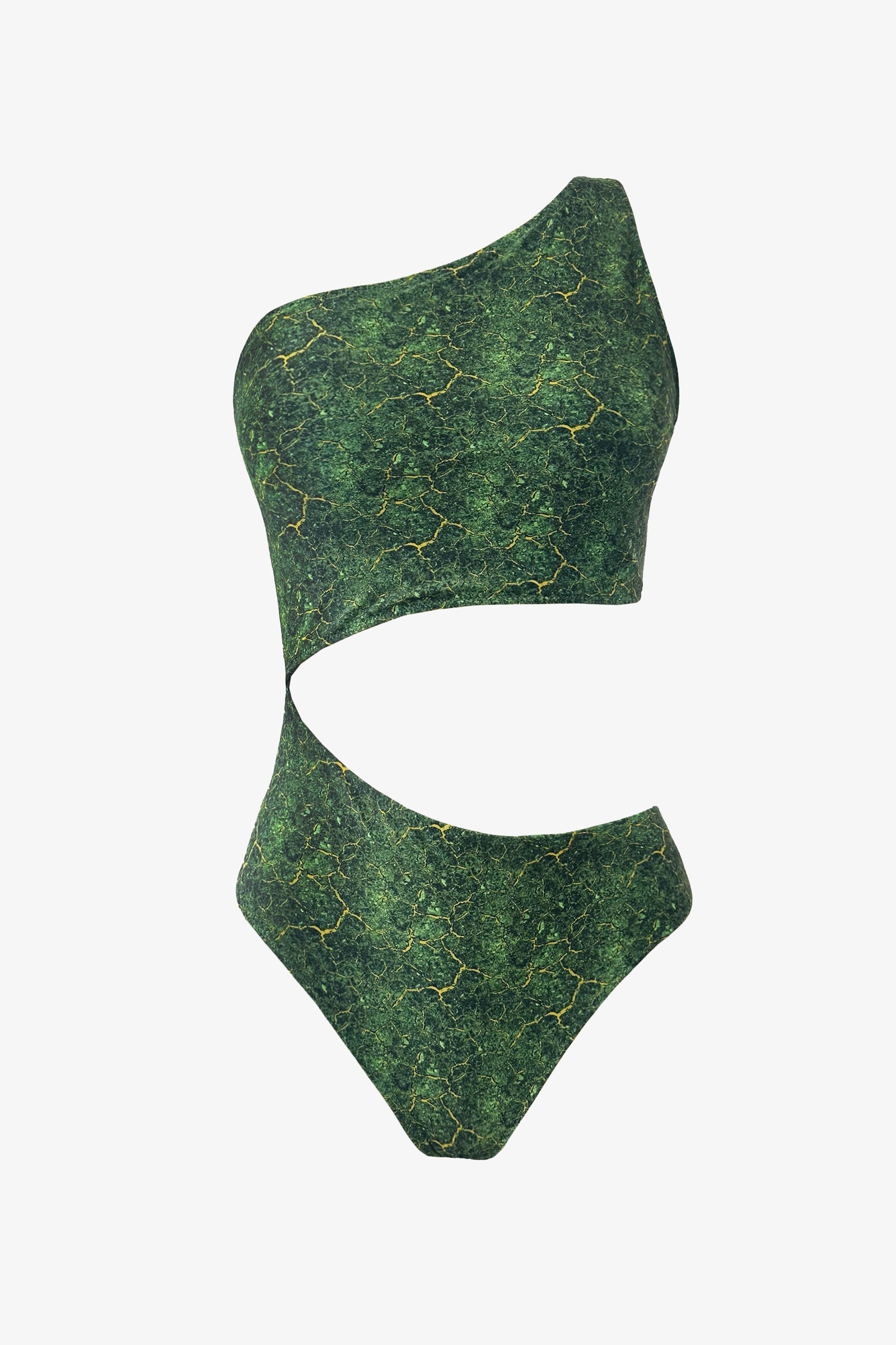 Il costume intero monospalla verde Tierra, con ampio taglio asimmetrico che svela la pelle, celebra la forza della terra e della trasformazione con una stampa vibrante di energia.