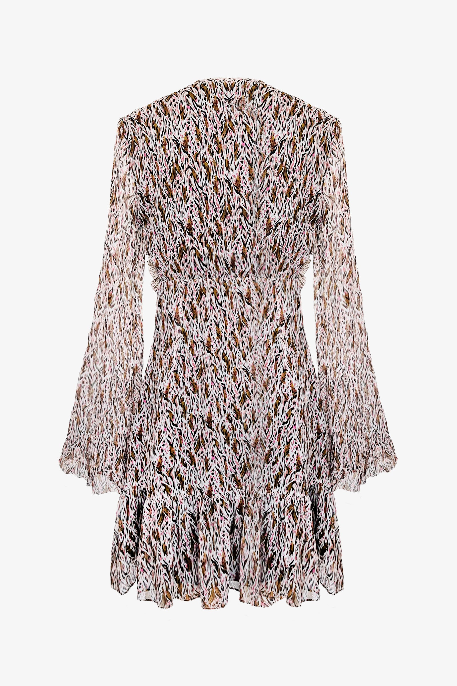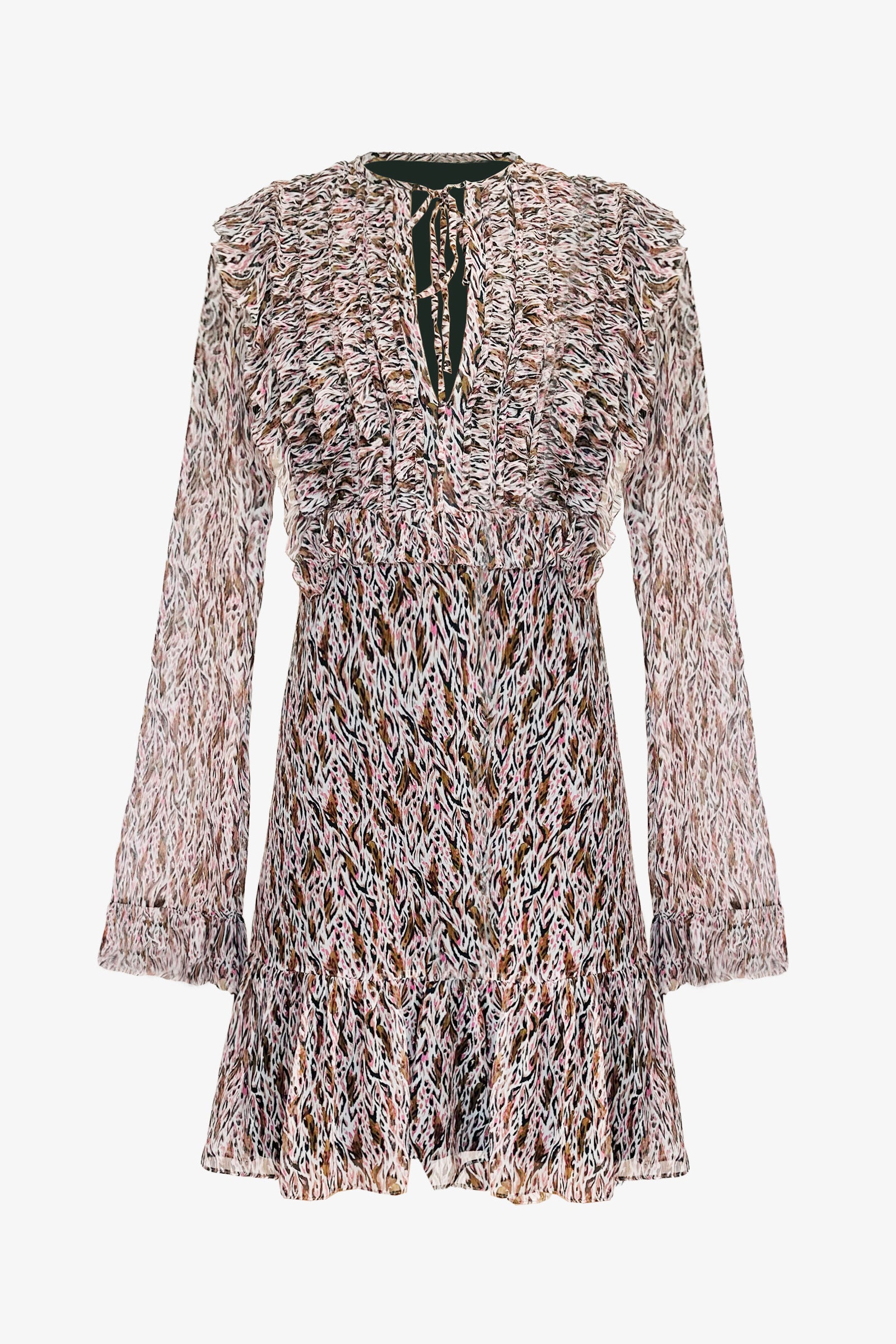 Be wild, be playful. Long-sleeved dress with ruffled yoke in camouflage-print silk crepon. Keyhole front.