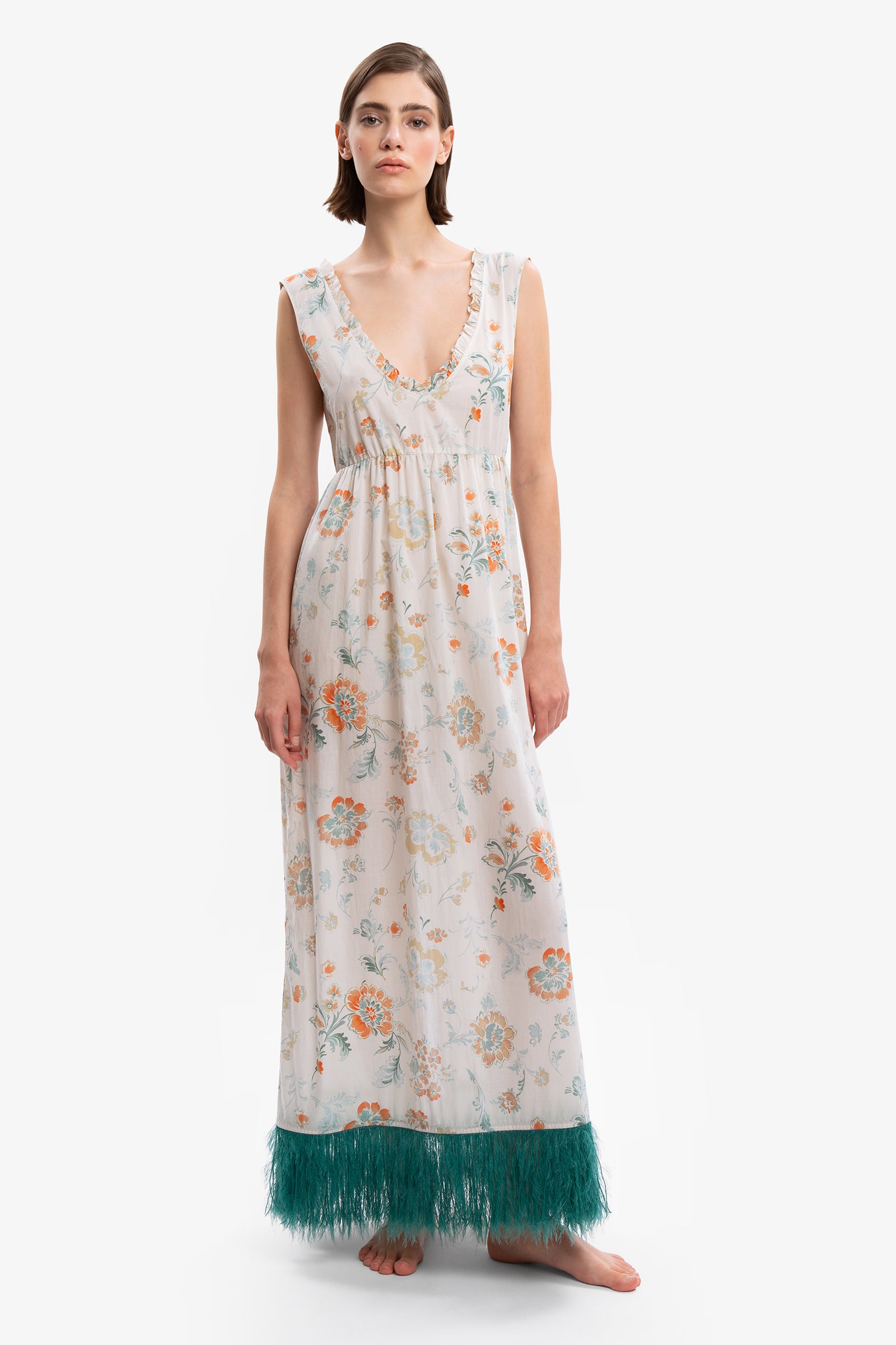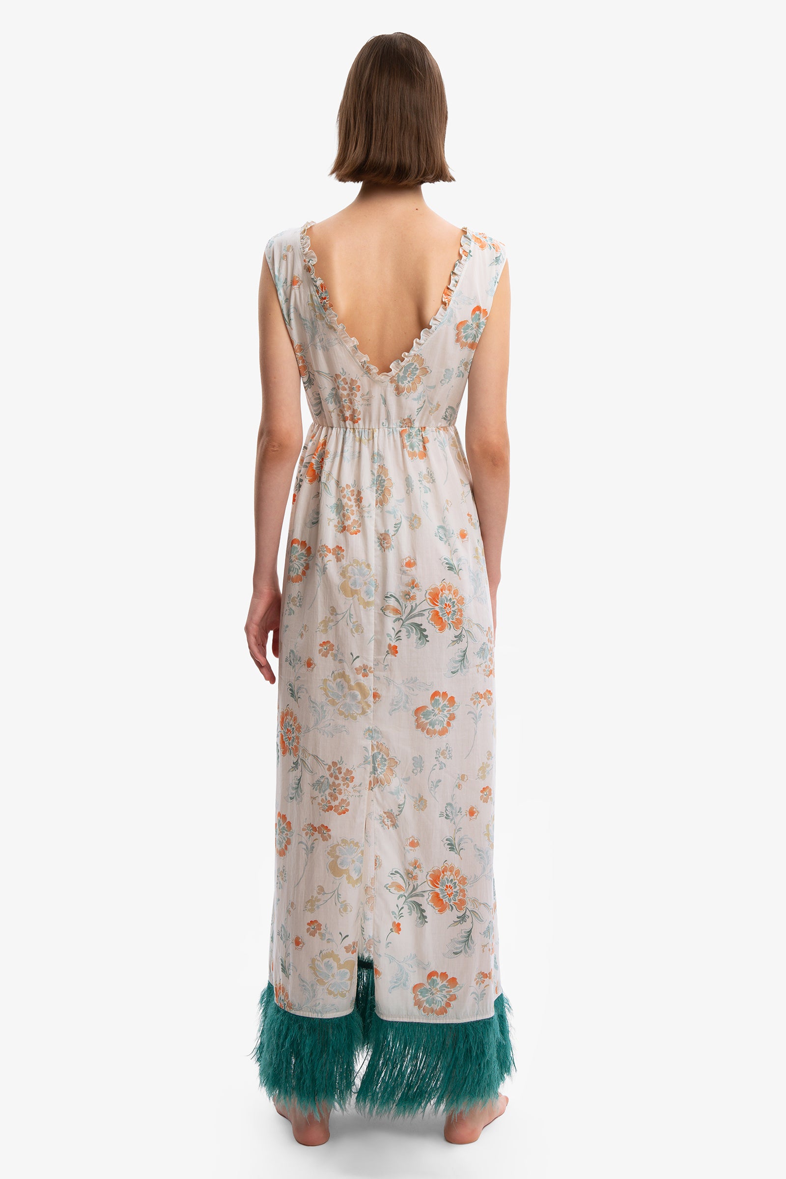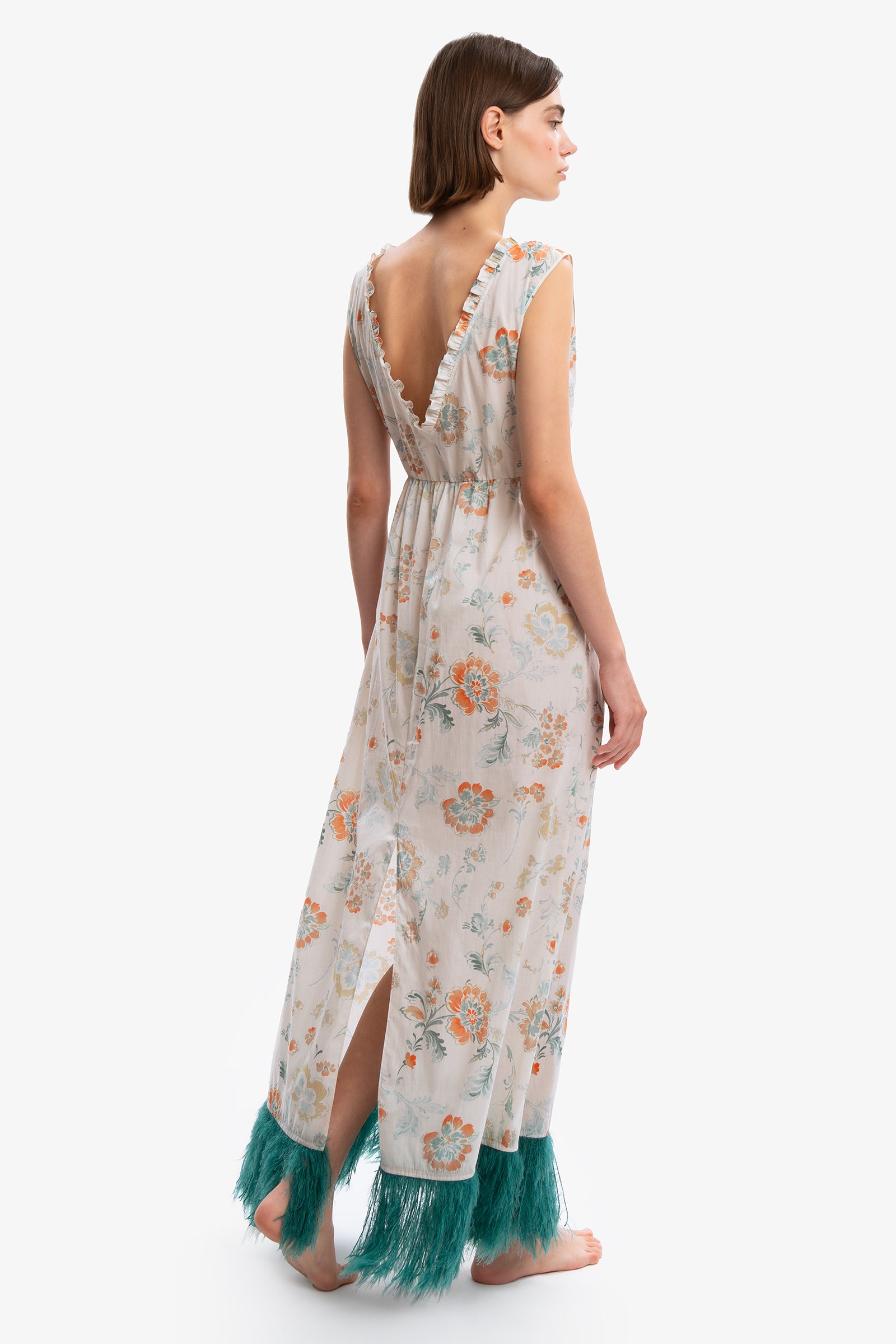 Like you no one ever has. Floral cotton dress with deep V-neck front and back. Empire style cut below the bust. Feather effect bangs on the super glamorous emerald green bottom and back slit.