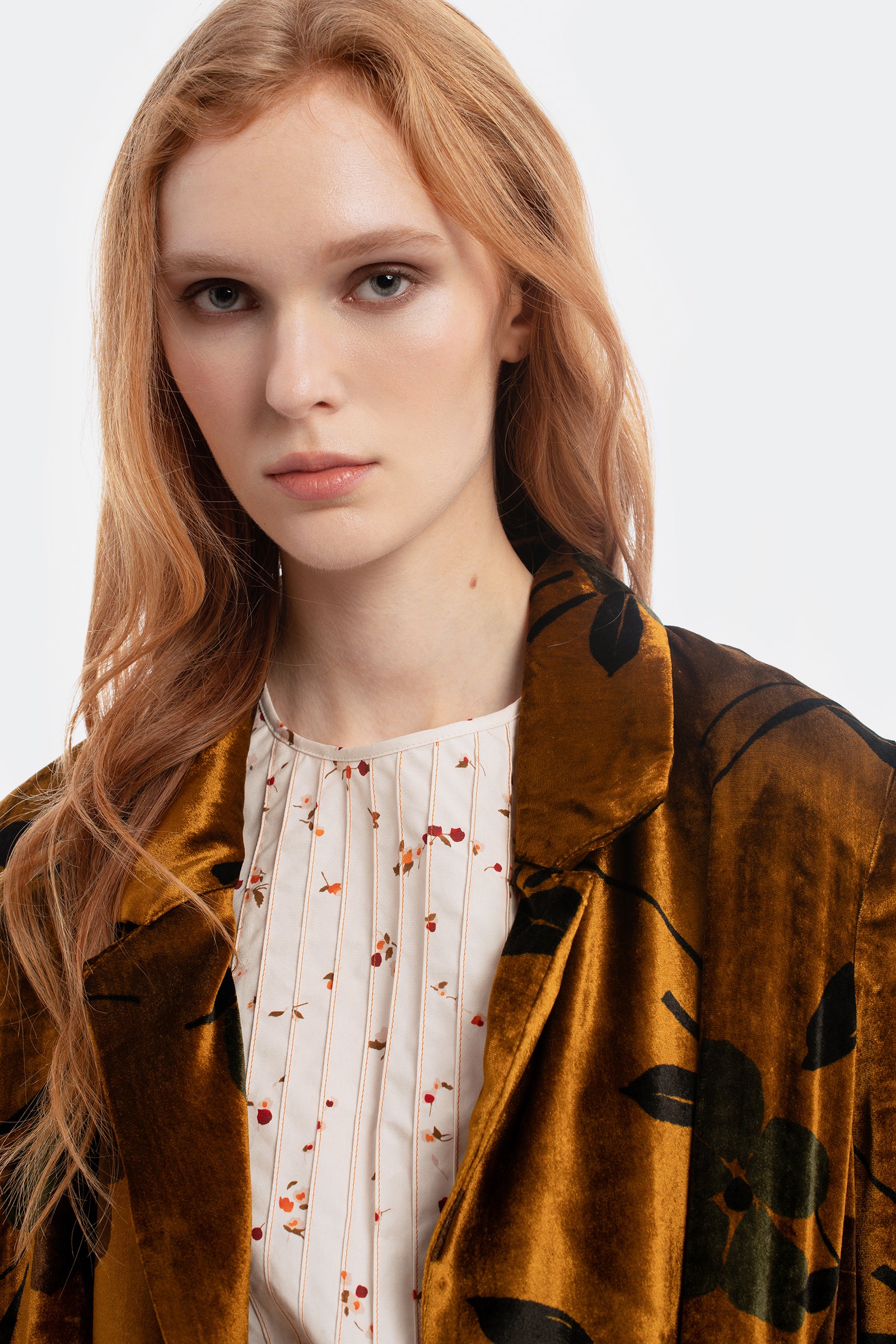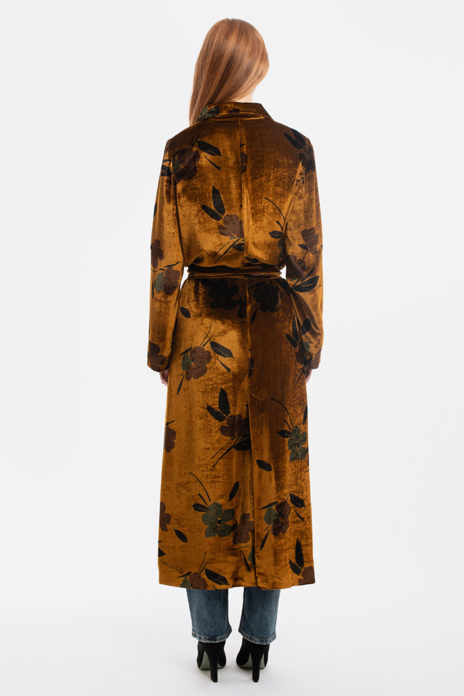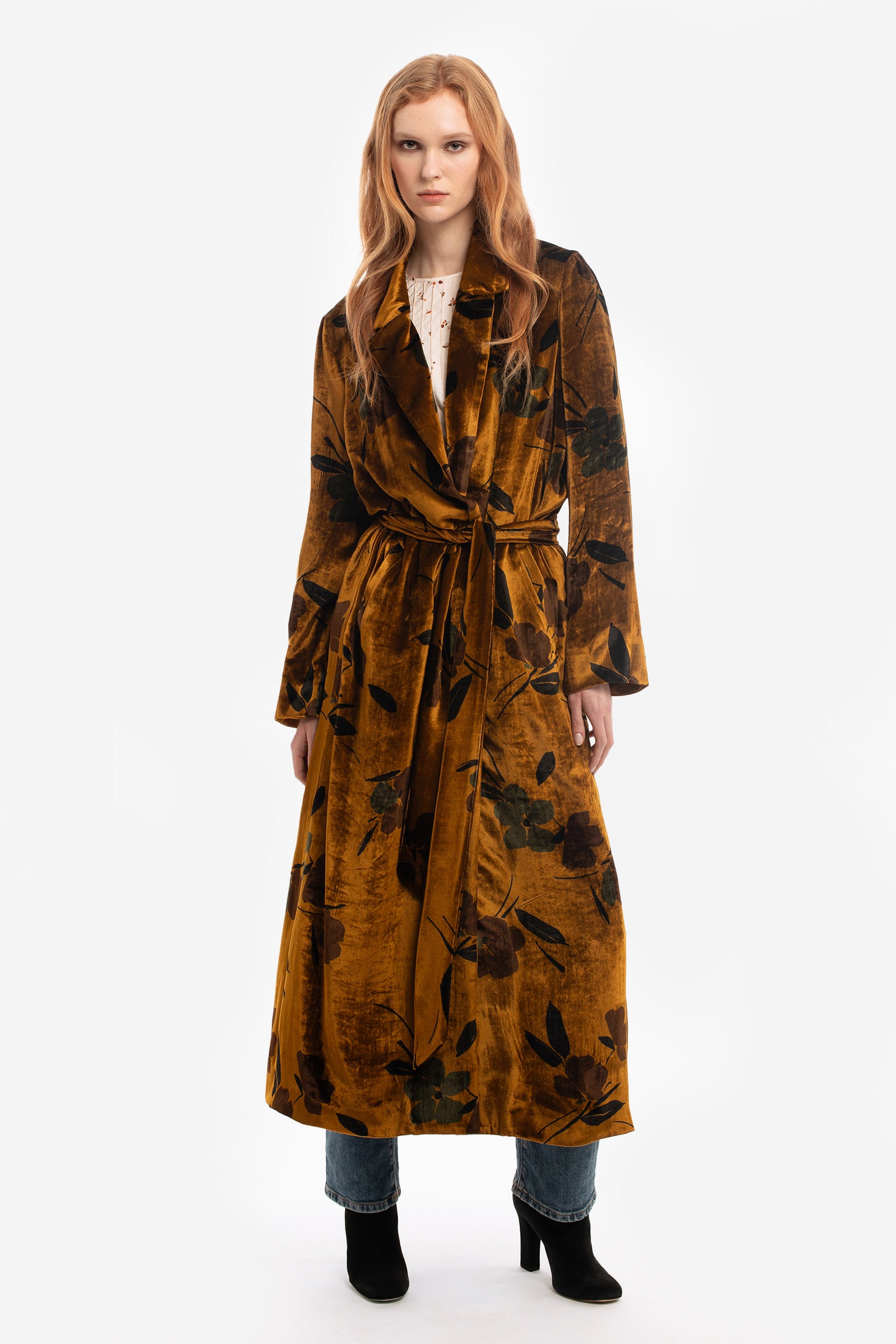 Everyday velvet. Dustcoat in silk velvet and iridescent viscose with floral print, lapel collar, side pockets, and paired belt at the waist. Night jacquard lining with Kristina Ti logo.