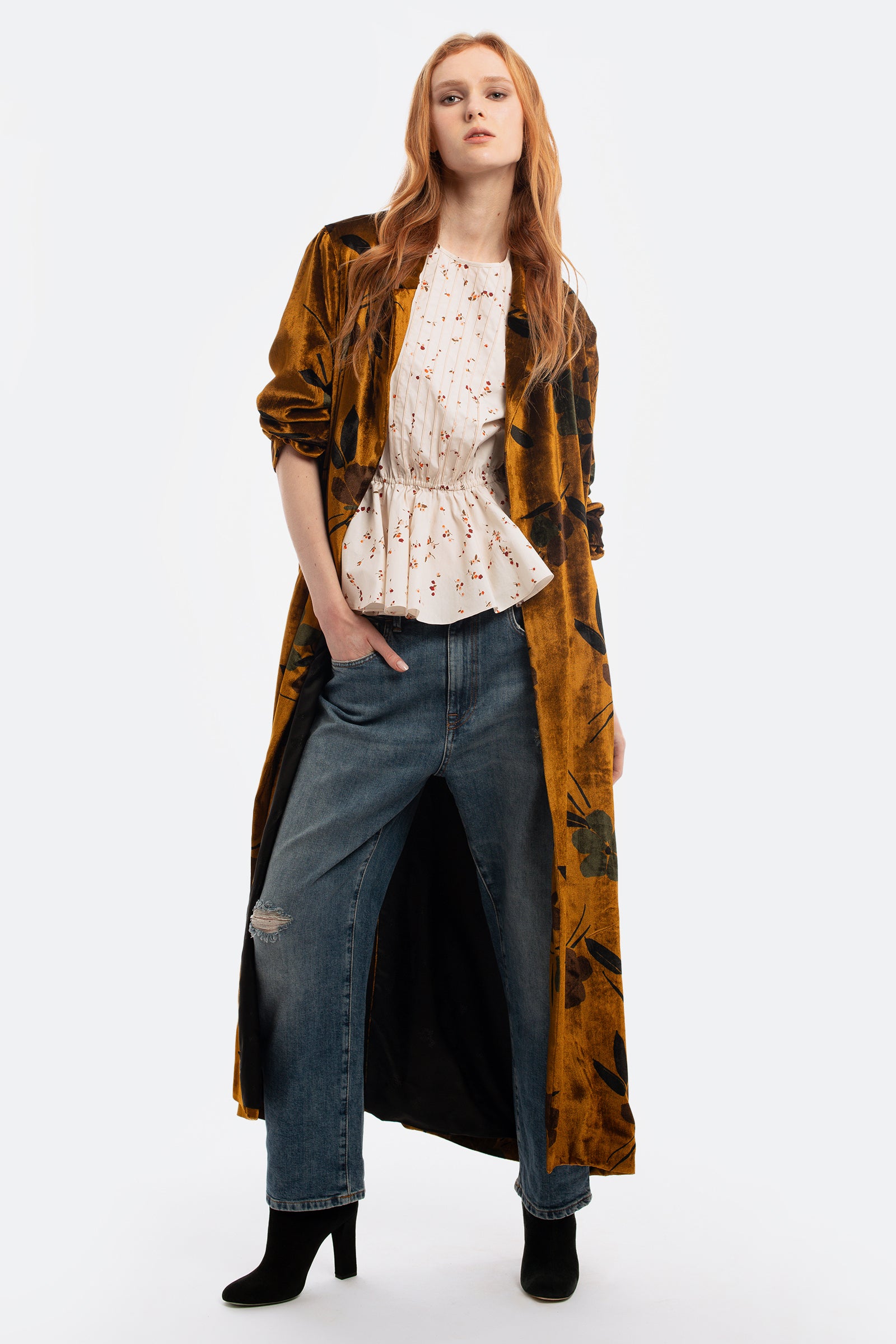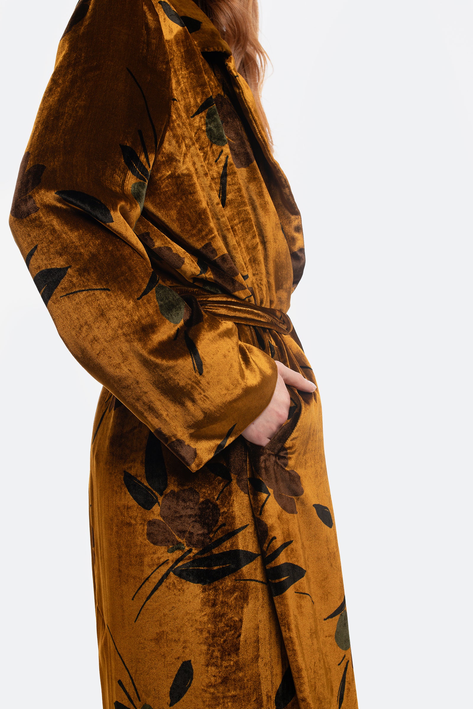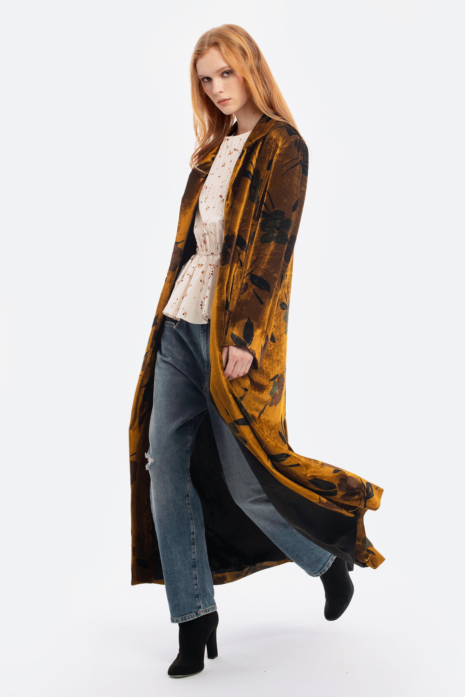 Everyday velvet. Dustcoat in silk velvet and iridescent viscose with floral print, lapel collar, side pockets, and paired belt at the waist. Night jacquard lining with Kristina Ti logo.