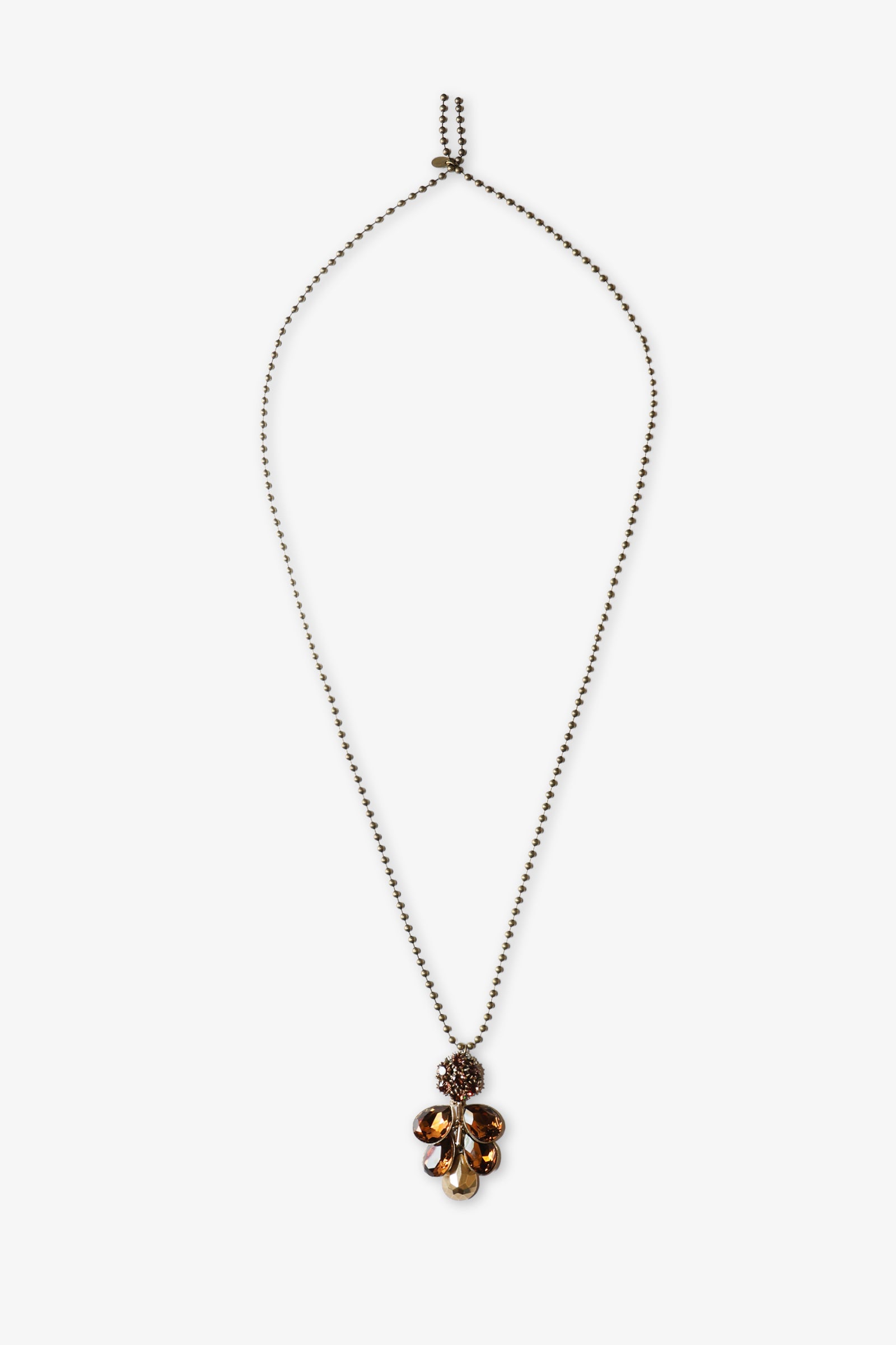 Pendant necklace featuring a luminous crystal button with elegant droplets. The chain is made of brass rounds.