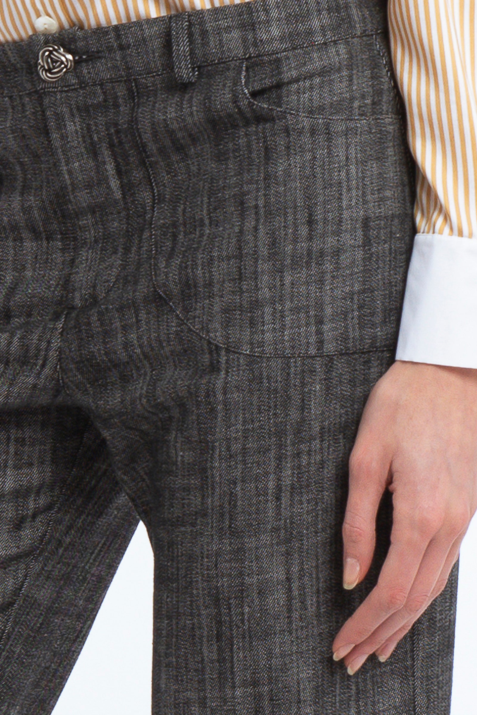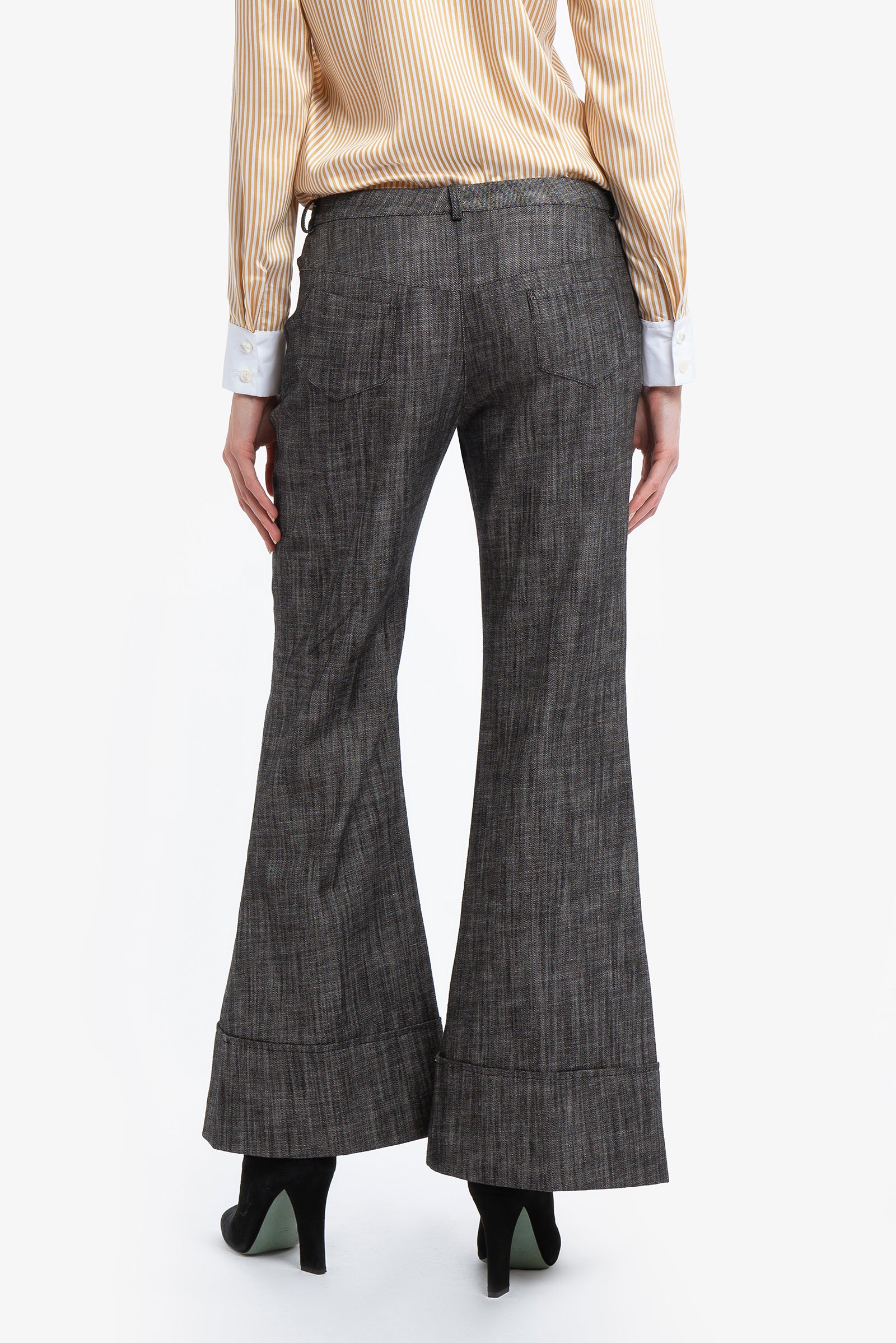 Urban attitude. Flared denim trousers with cuffs and large patch pockets. Jewel button closure. Wear with the MARGOT shirt.