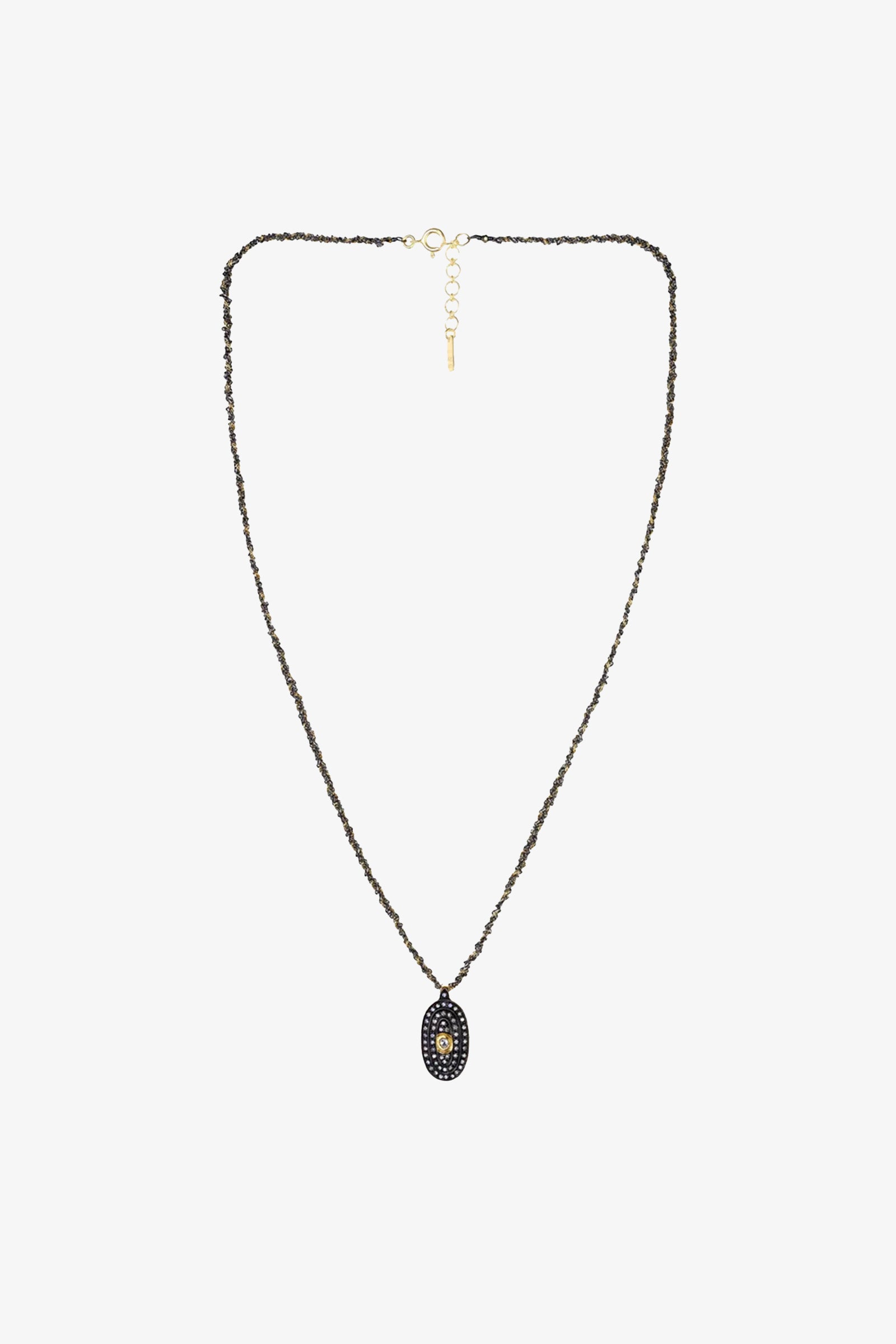 925 sterling silver braided necklace made with ruthenium-plated chains and gold-tone lurex threads. The necklace is embellished with an oxidized silver medallion, featuring a Polki diamond and mini irregular diamonds.