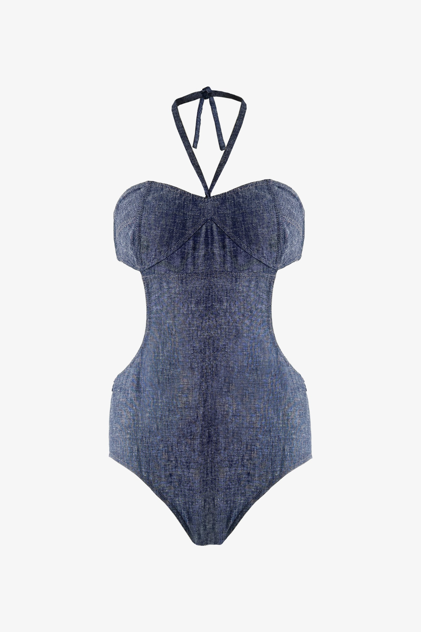 Don’t call it just denim. Halterneck cutout bodysuit with open back, in denim-effect linen with contrasting rust stitching.