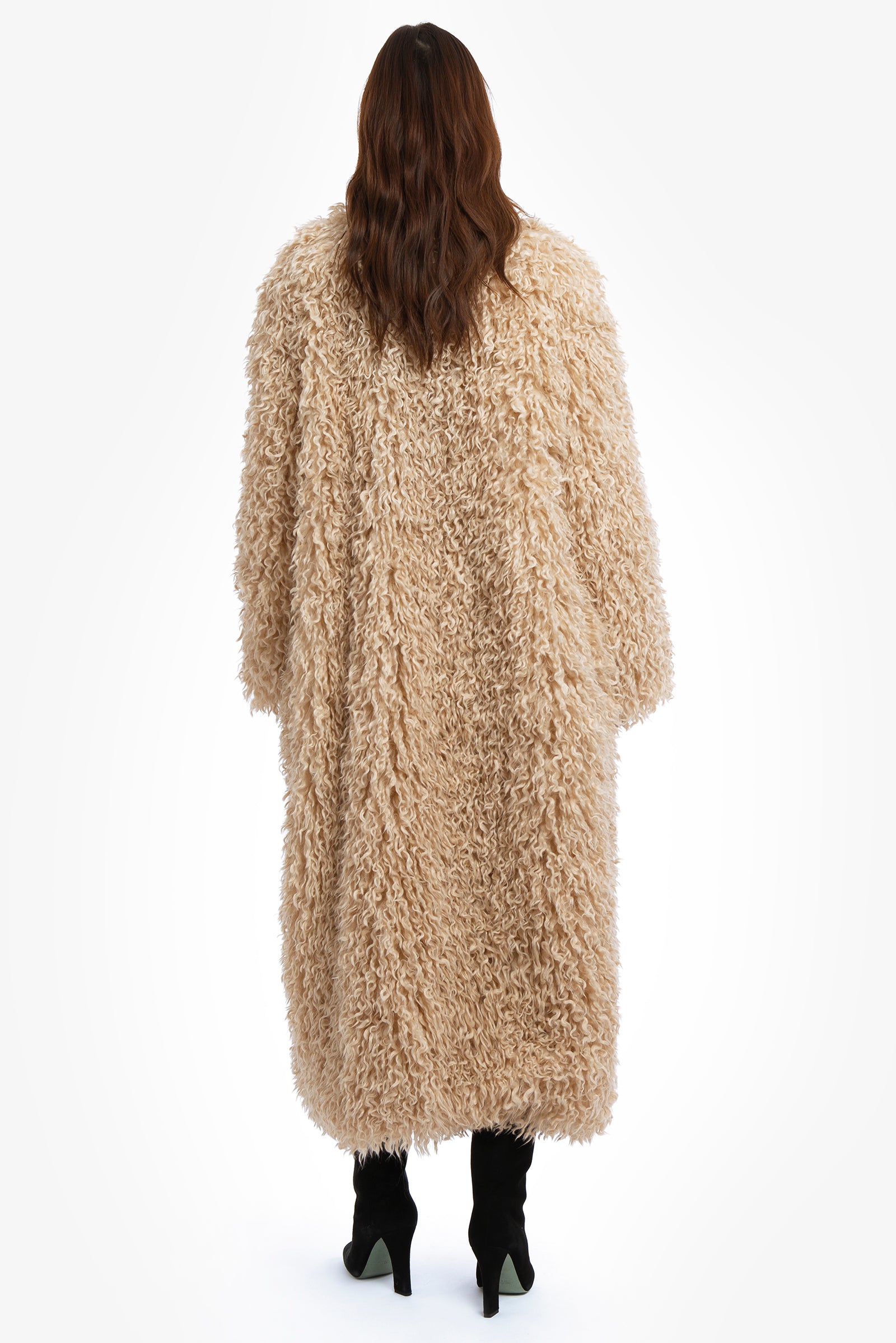 In una parola, lussuoso. Cappotto over eco-furry girocollo con bottoni rivestiti in tessuto e fodera interna in jacquard.