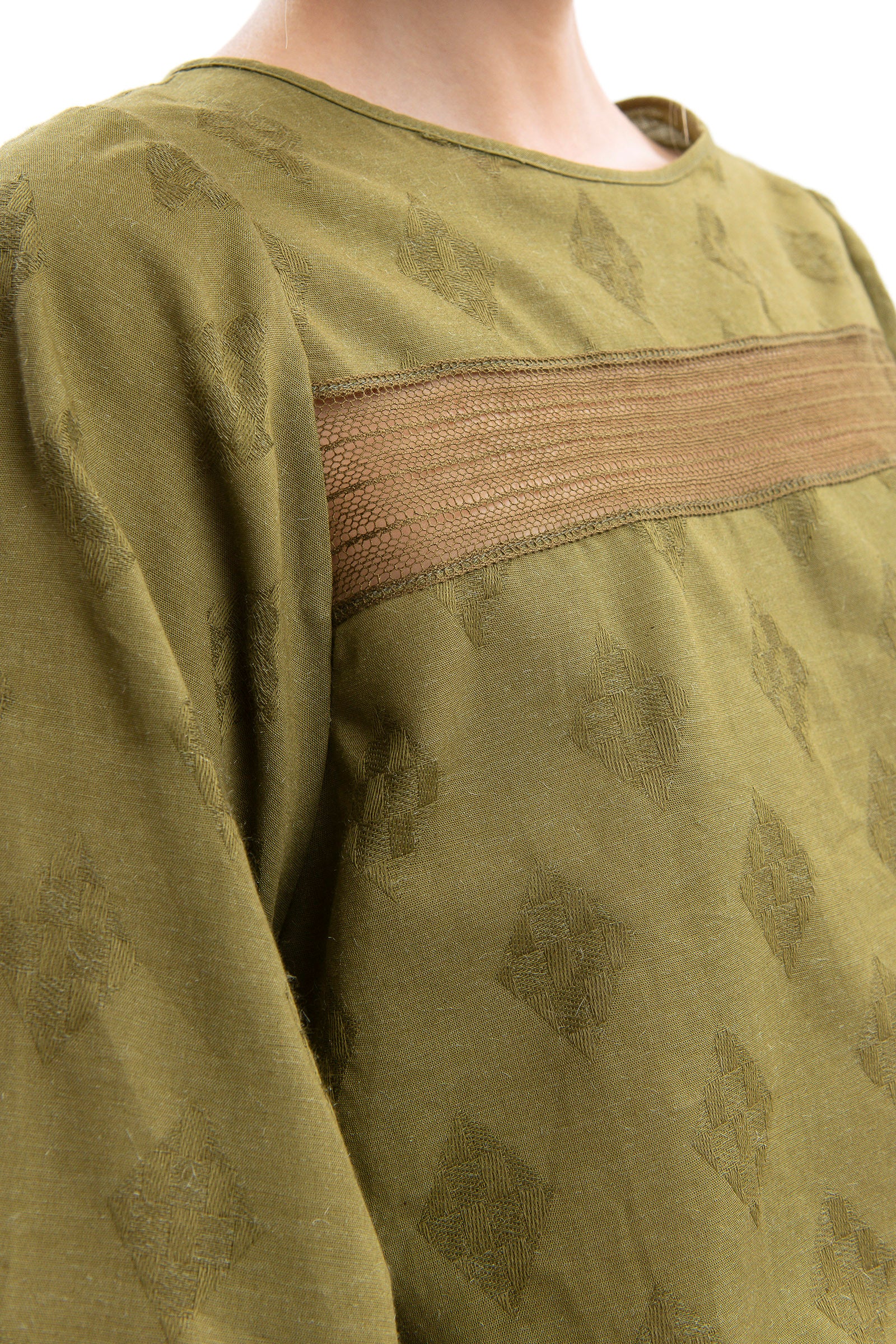 Blusa girocollo in jacquard di cotone seta con disegno a rombi. Inserto in passamaneria entre-deux effetto vedo non vedo, maniche svasate a tre quarti con volant.