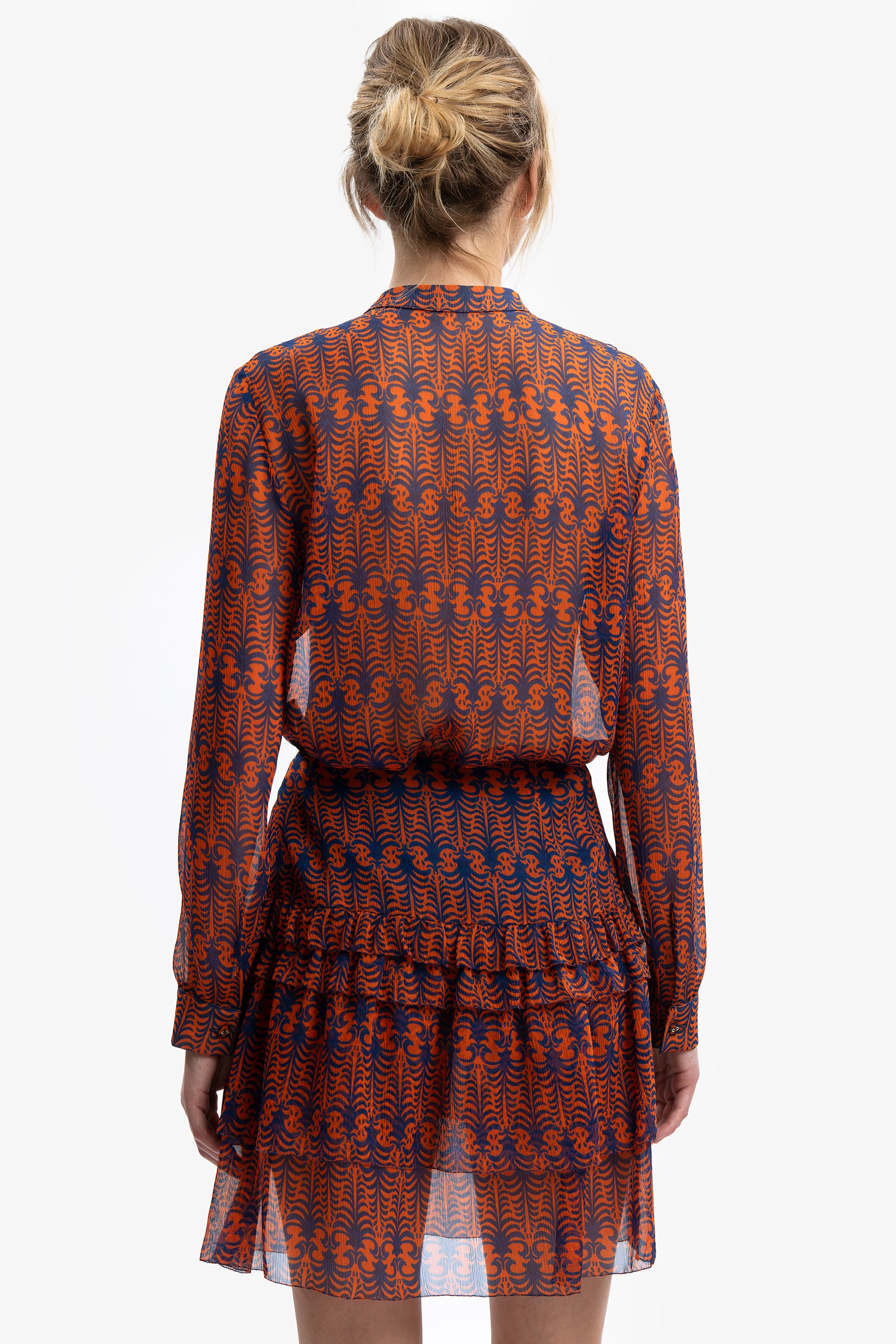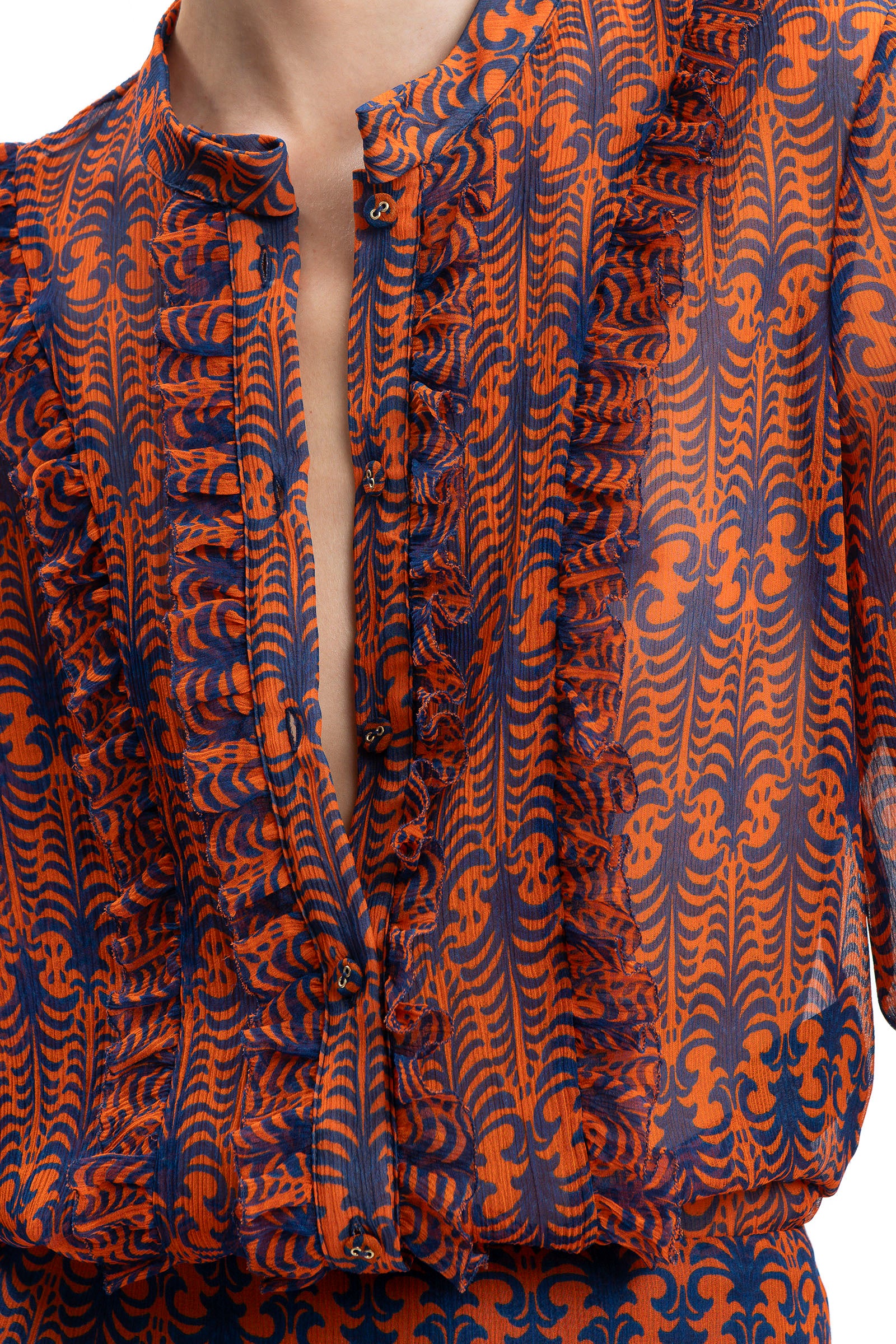 Camicia in seta con colletto alla coreana e rouches sul davanti. Maniche lunghe con polsino.