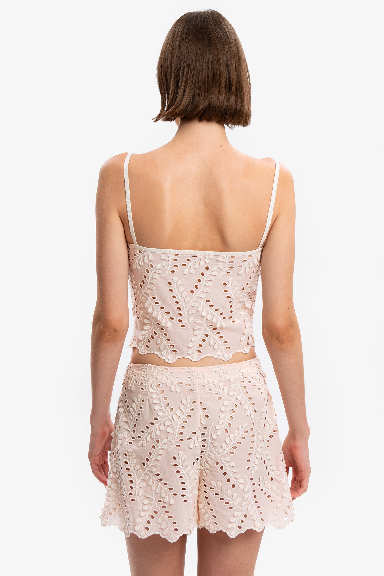 Baci da Saint Tropez. Shorts in cotone ricamato con un gioco di rilievi e trafori e smerlo sull’orlo. Abbinali al top AVA per un total look coordinato.
