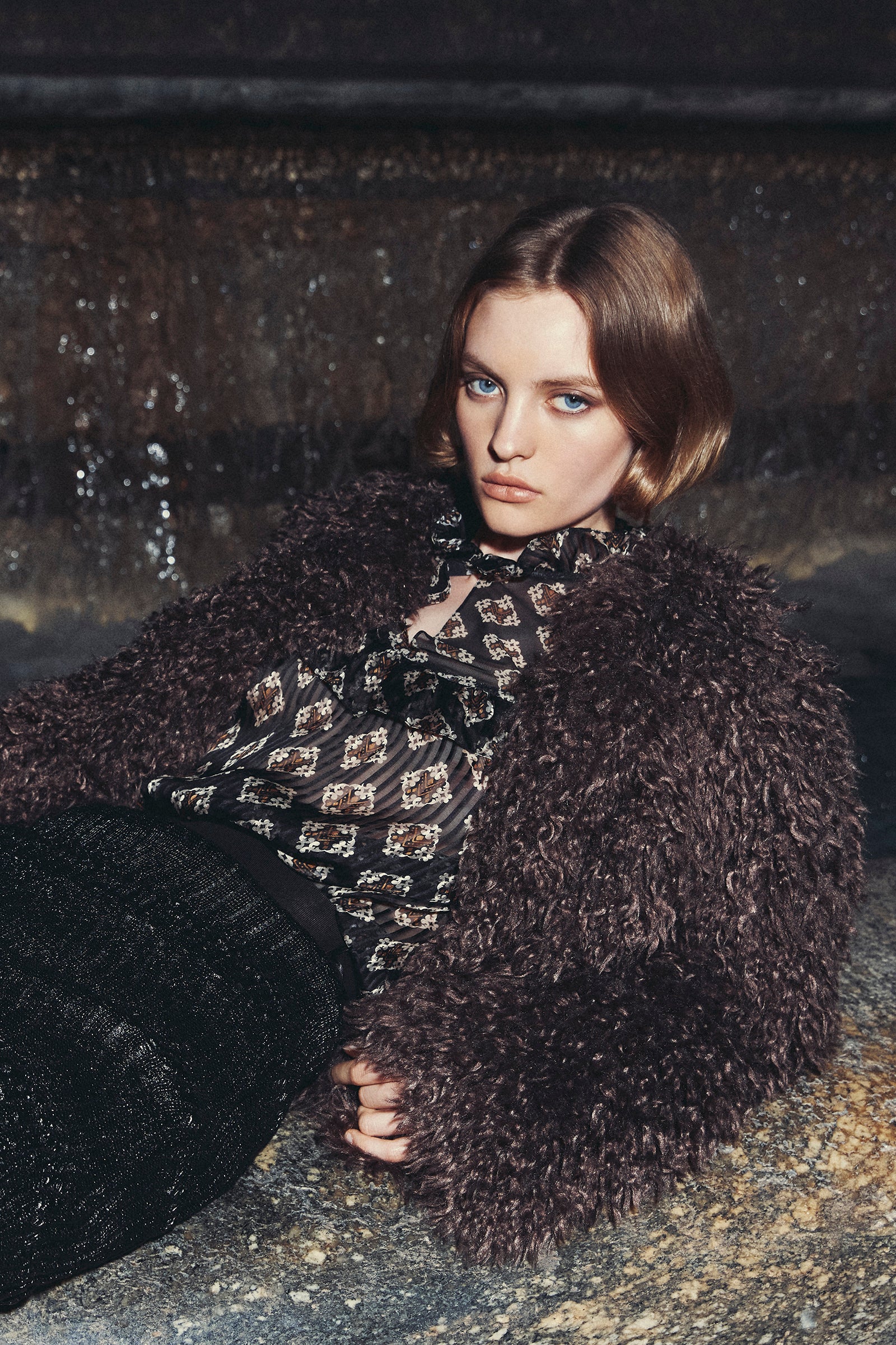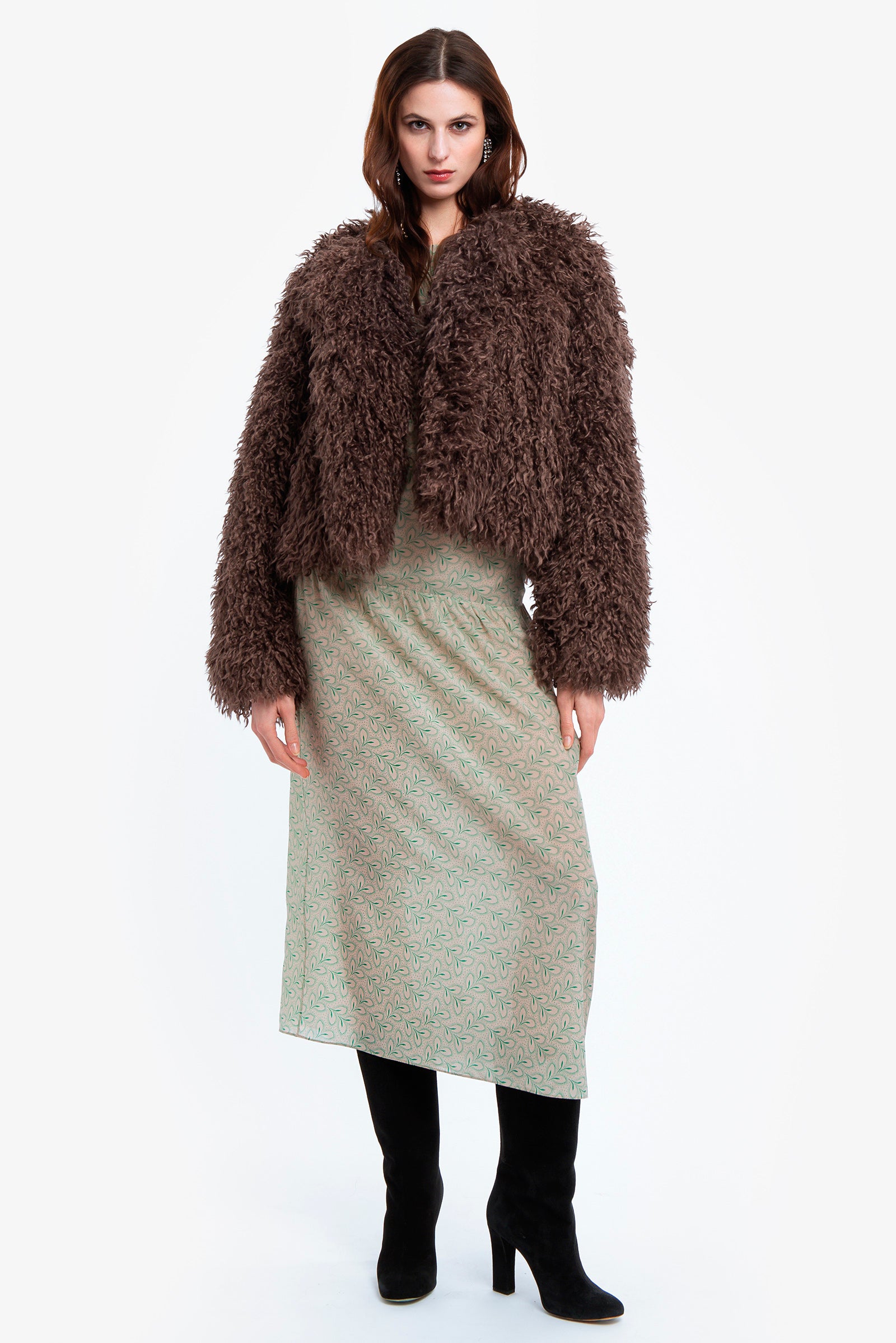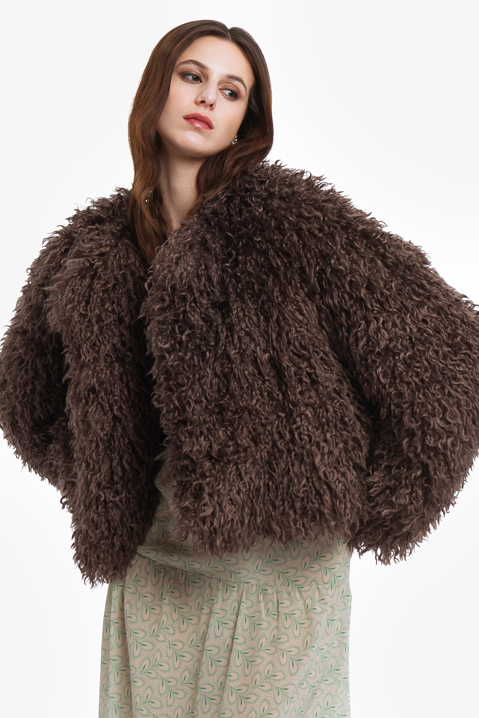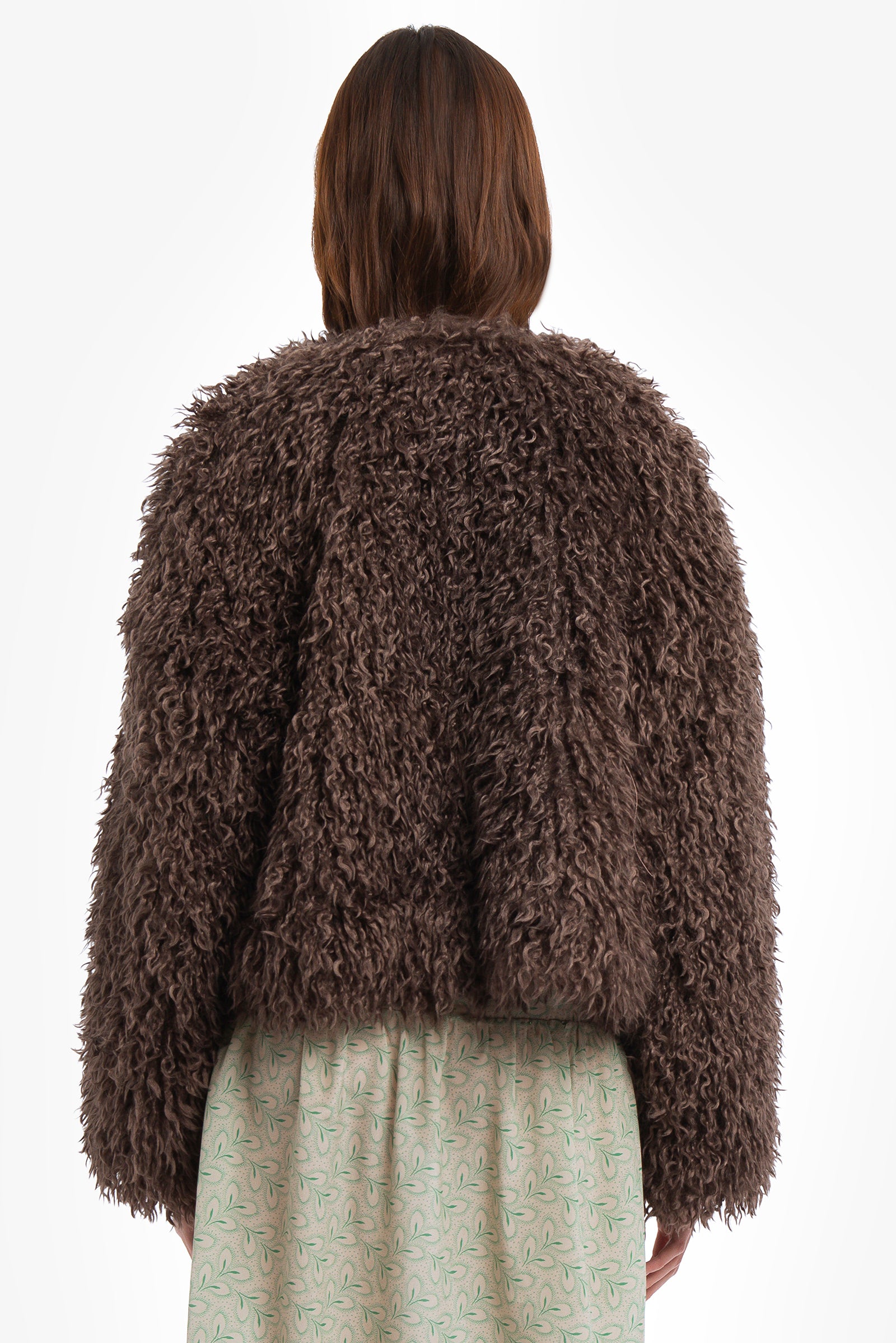 In una parola, lussuosa. Giacca over eco-furry girocollo con bottoni rivestiti in tessuto e fodera interna in jacquard.