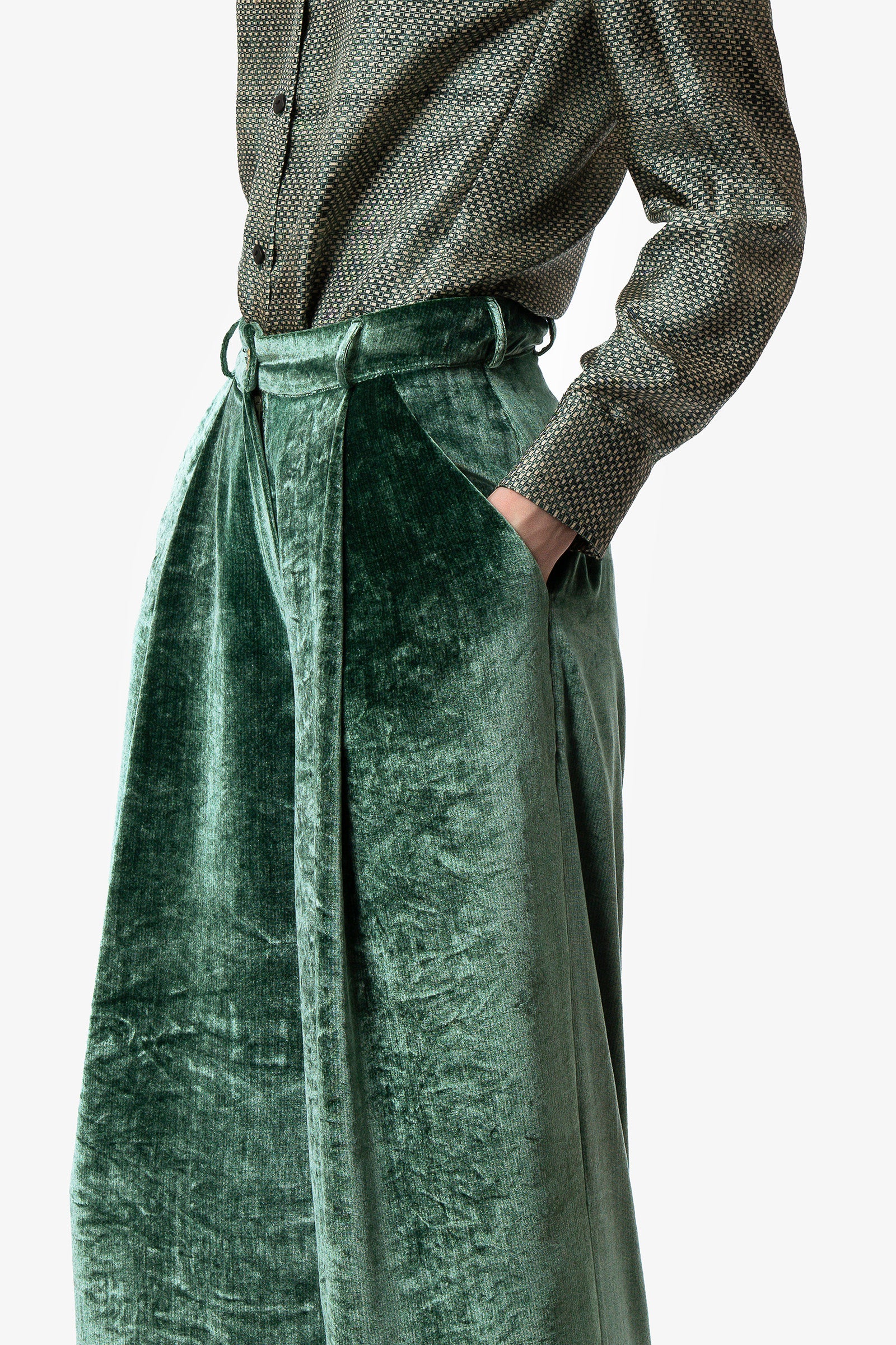 Everyday velvet. Pantalone ampio con pinces in velluto di seta e viscosa cangiante. Chiusura con bottone gioiello.