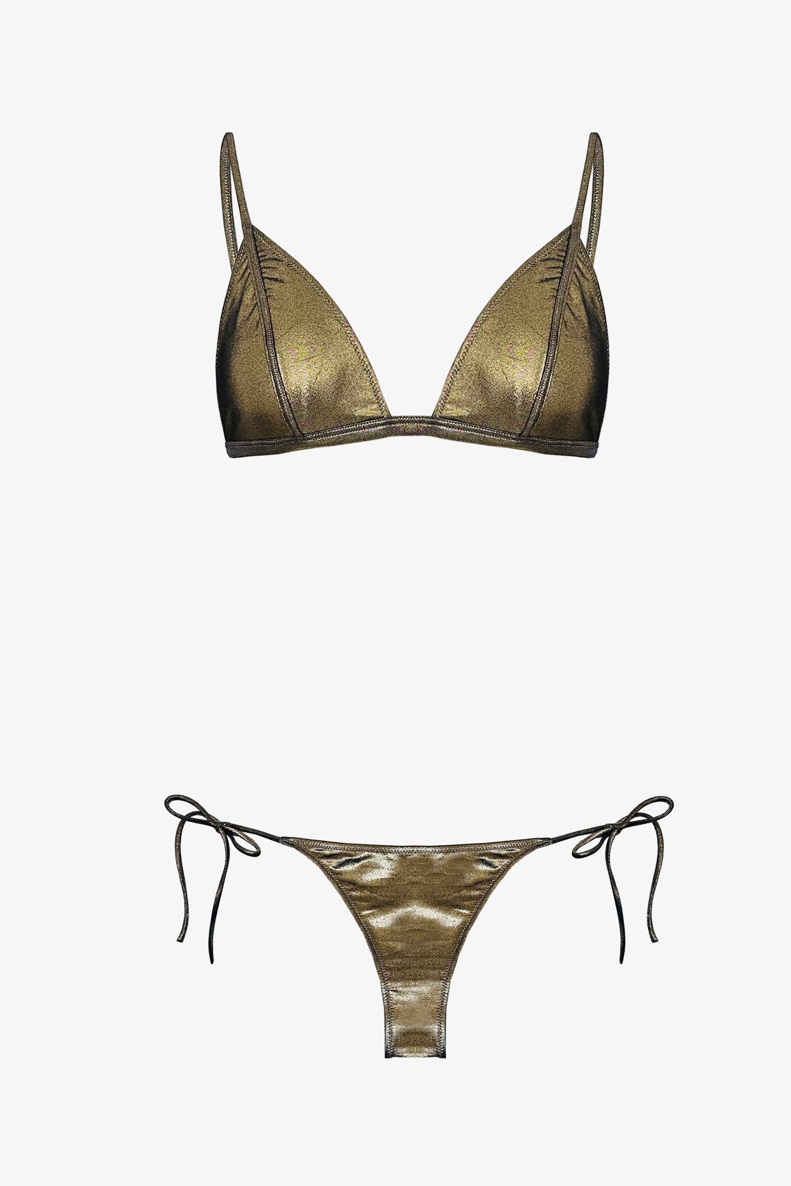 Il bikini metal gold, con top a triangolo fisso e slip sgambato con lacci, è reso unico dalla superficie mossa e dai riflessi metallici del tessuto, che richiamano le sfere di Bosco Sodi dedicate al cosmo e all’energia dell’universo.