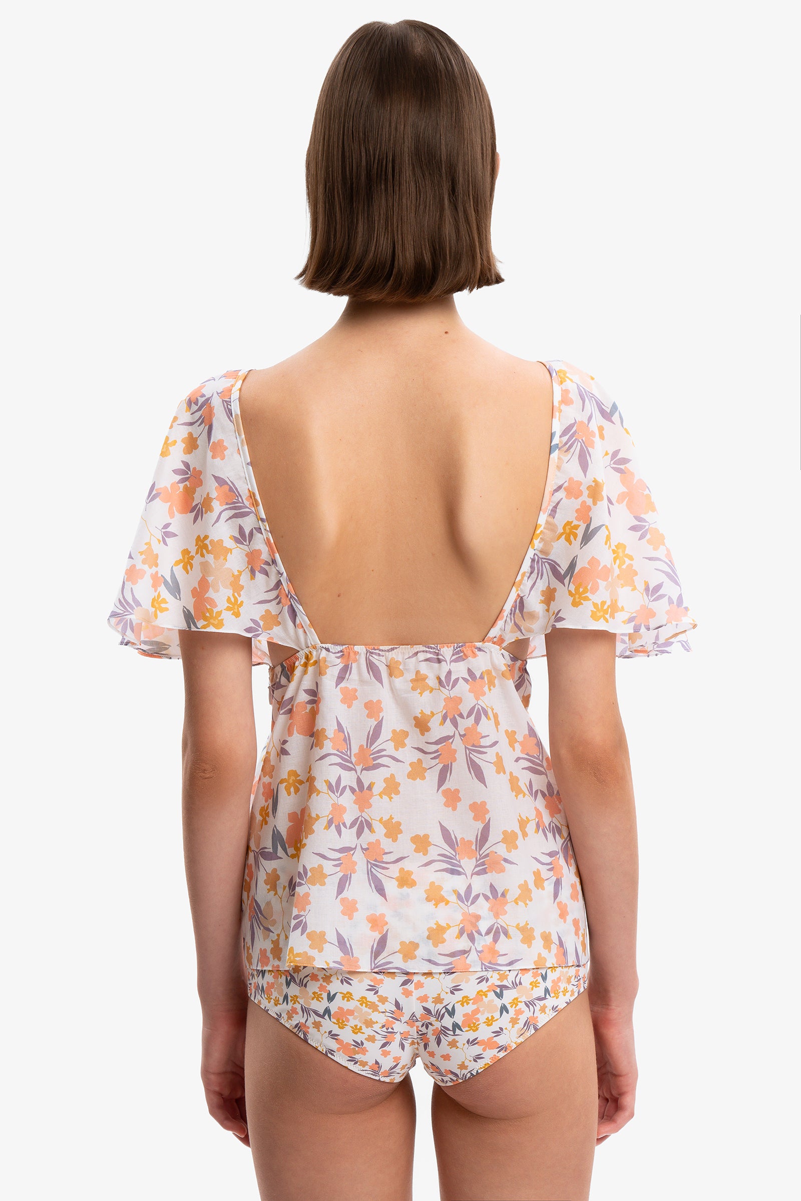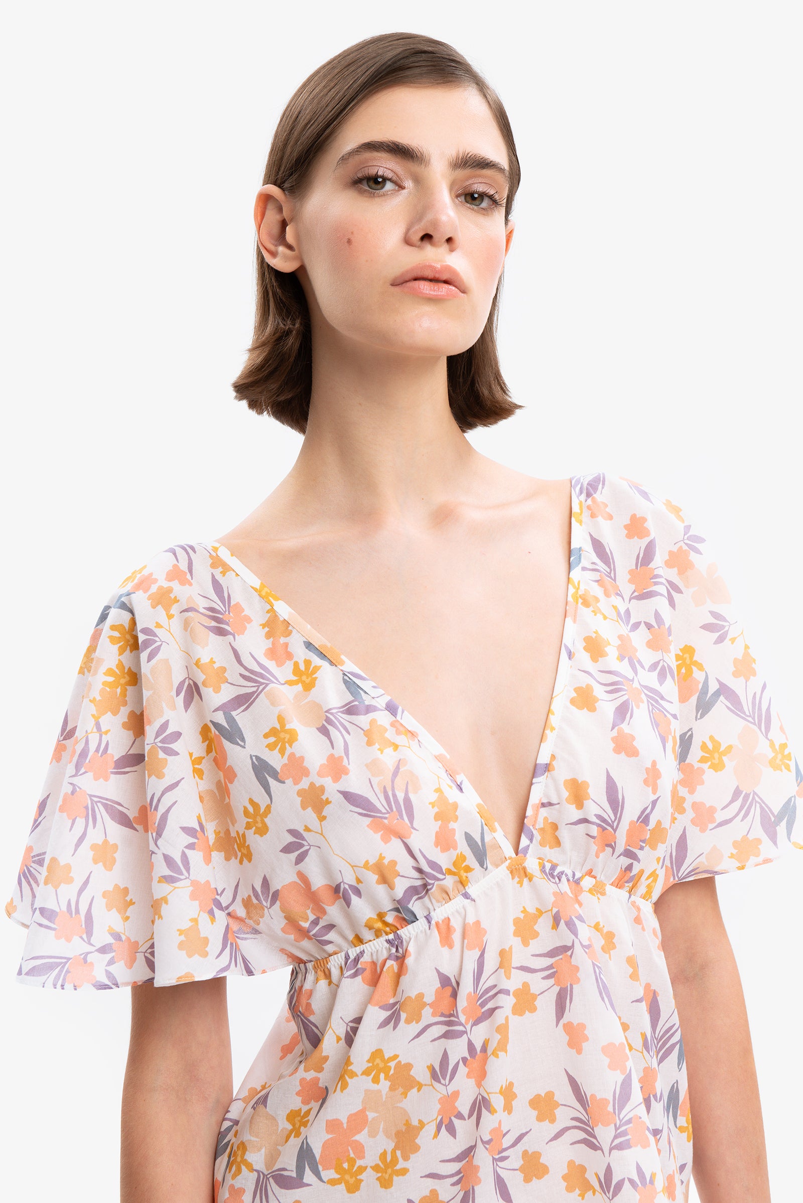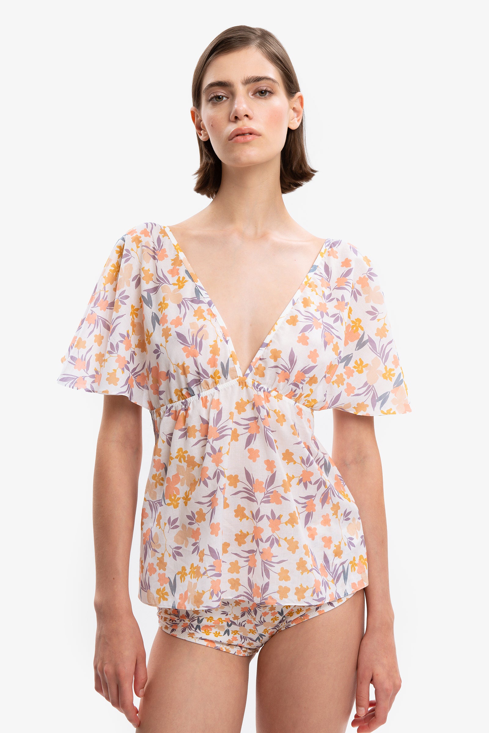 L’estate addosso. Blusa kimono in cotone floreale con taglio sotto il seno, arriccio e scollo profondo a V.