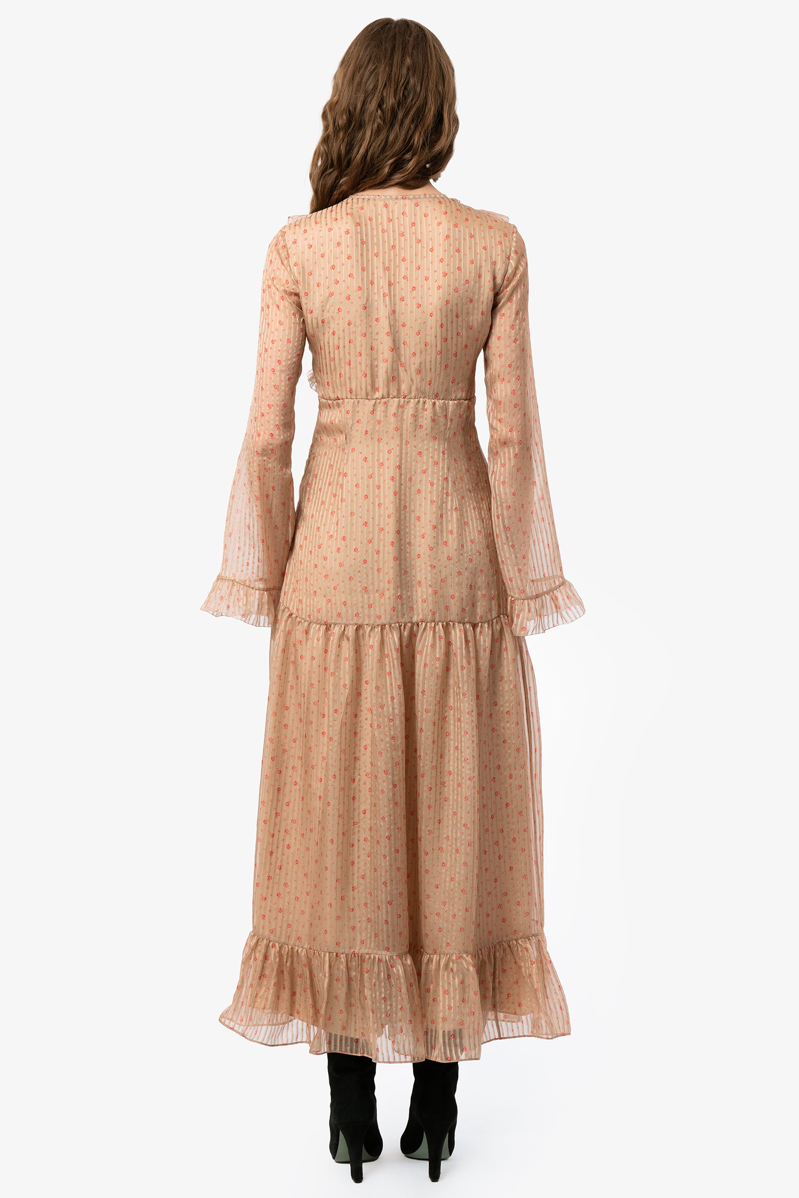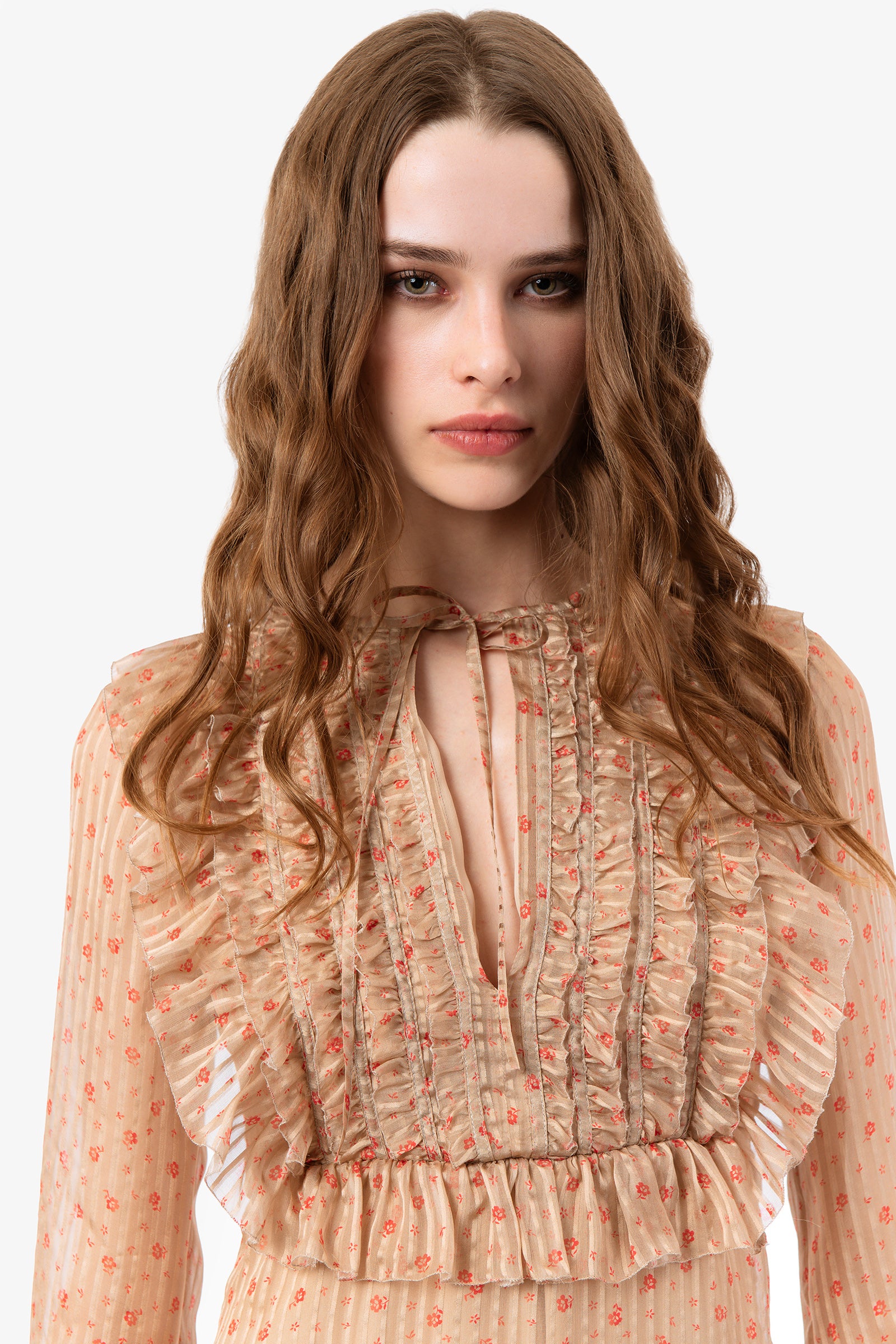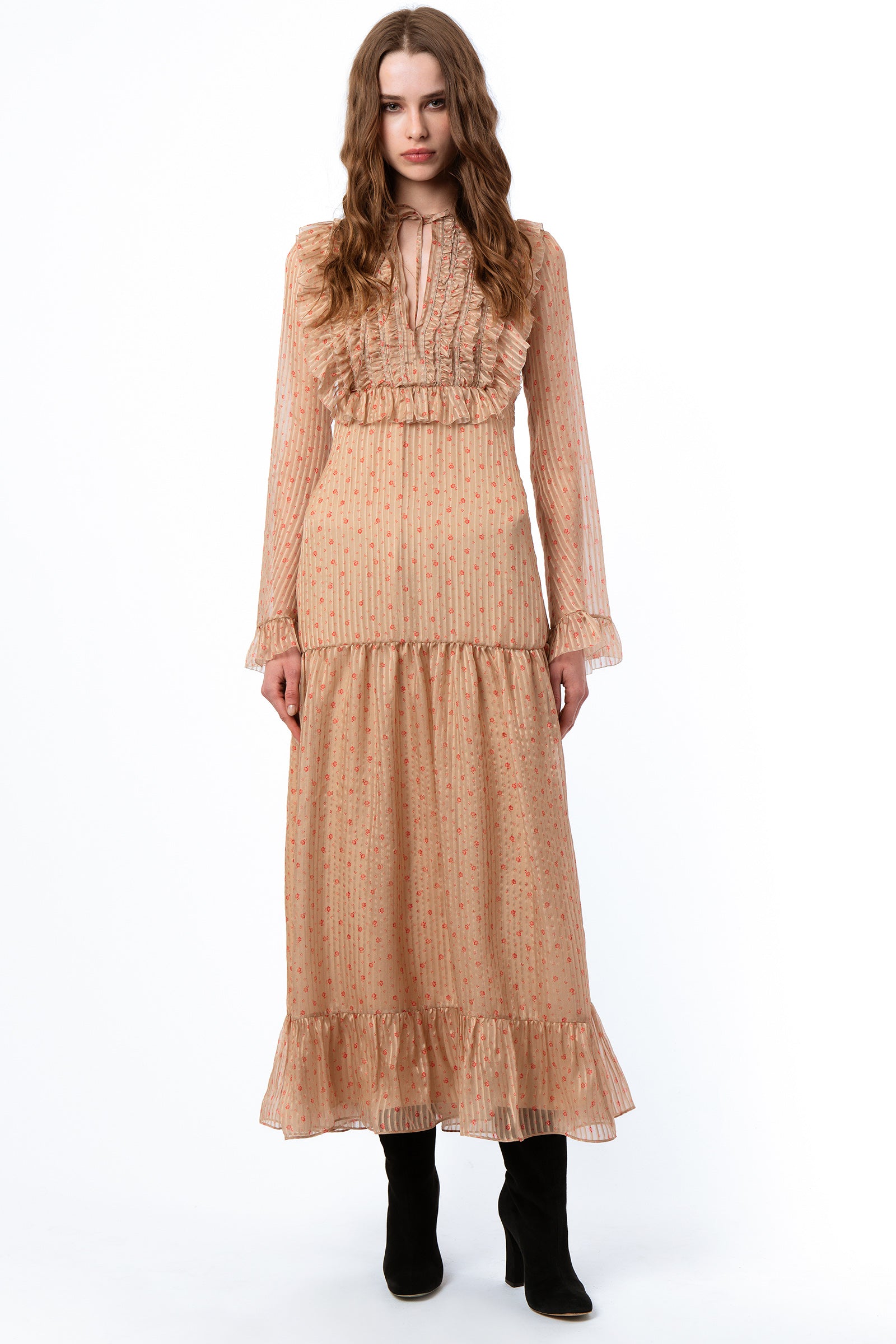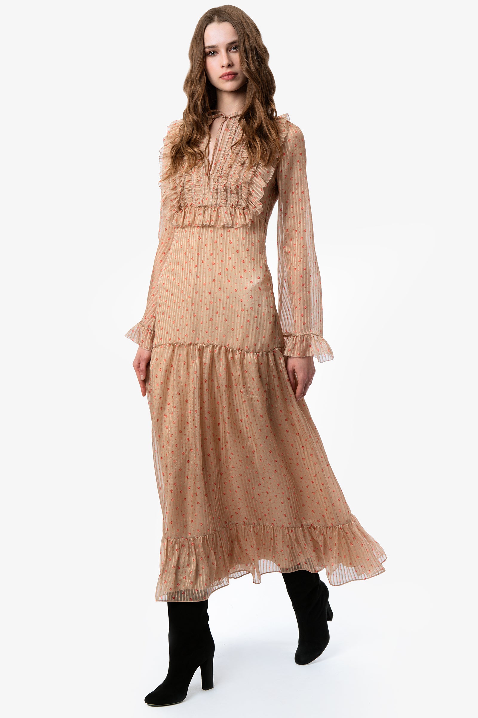 Bold, Chic, Decò. Abito lungo in seta con rouches sul decolletè, allacciato al collo con nastri. Balza sul fondo e lunghe maniche che terminano con volant.