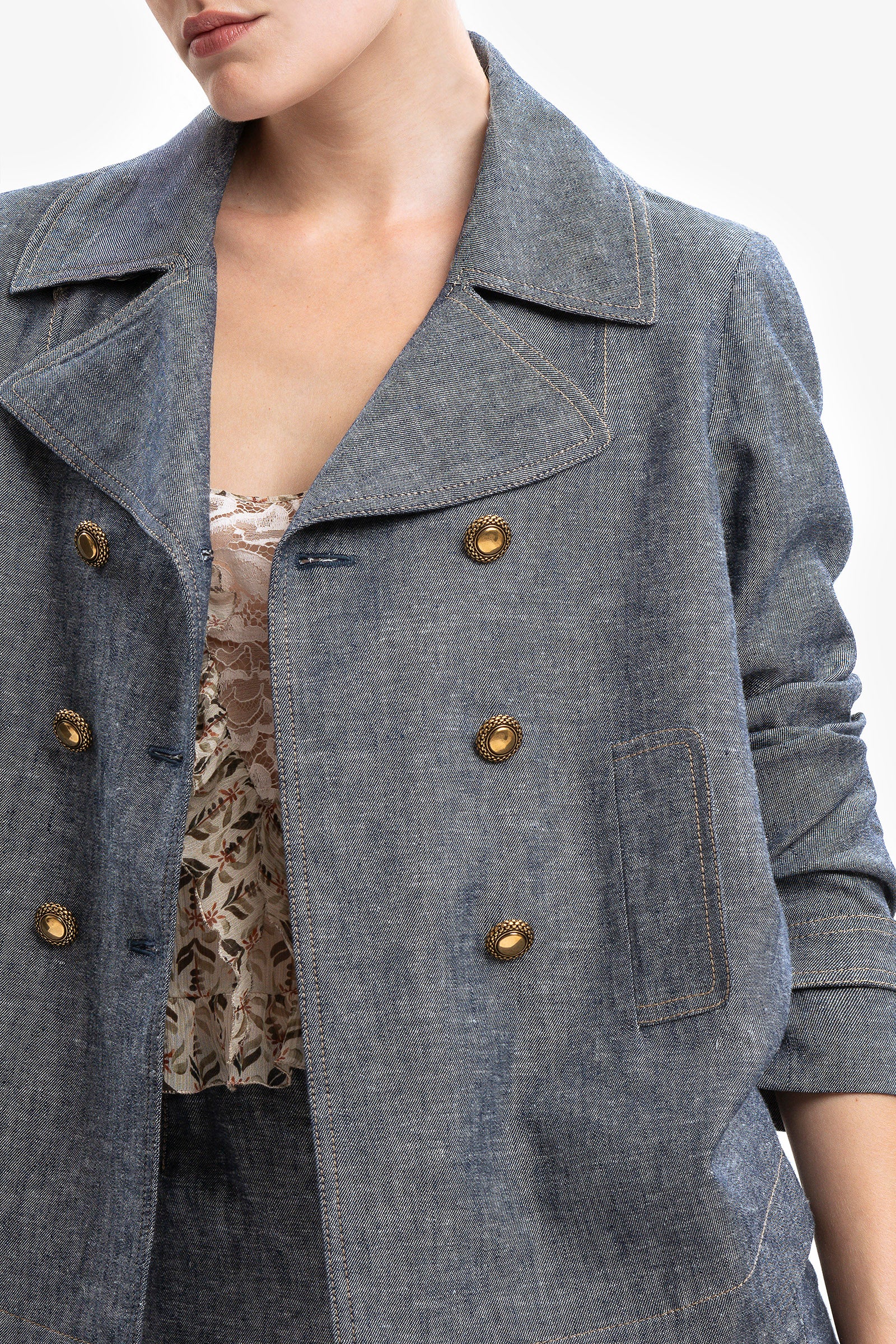 Sotto cieli urbani. Blazer doppiopetto in lino e viscosa effetto denim con rever a specchio. Bottoni gioiello e tasche a filetto. Impunture ruggine a contrasto. Abbinalo in total look alla culotte CATALINA.