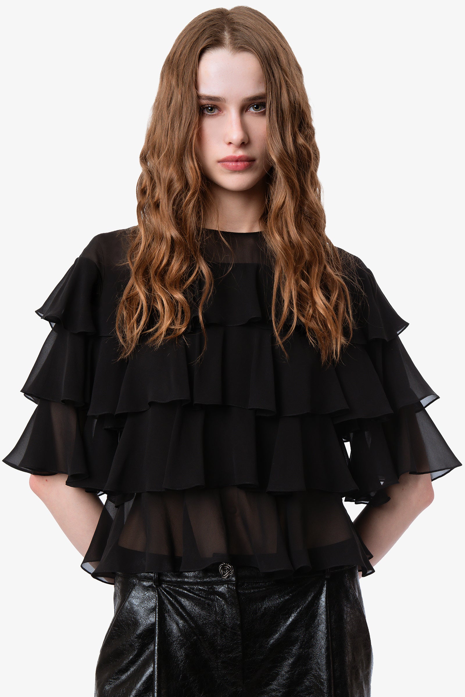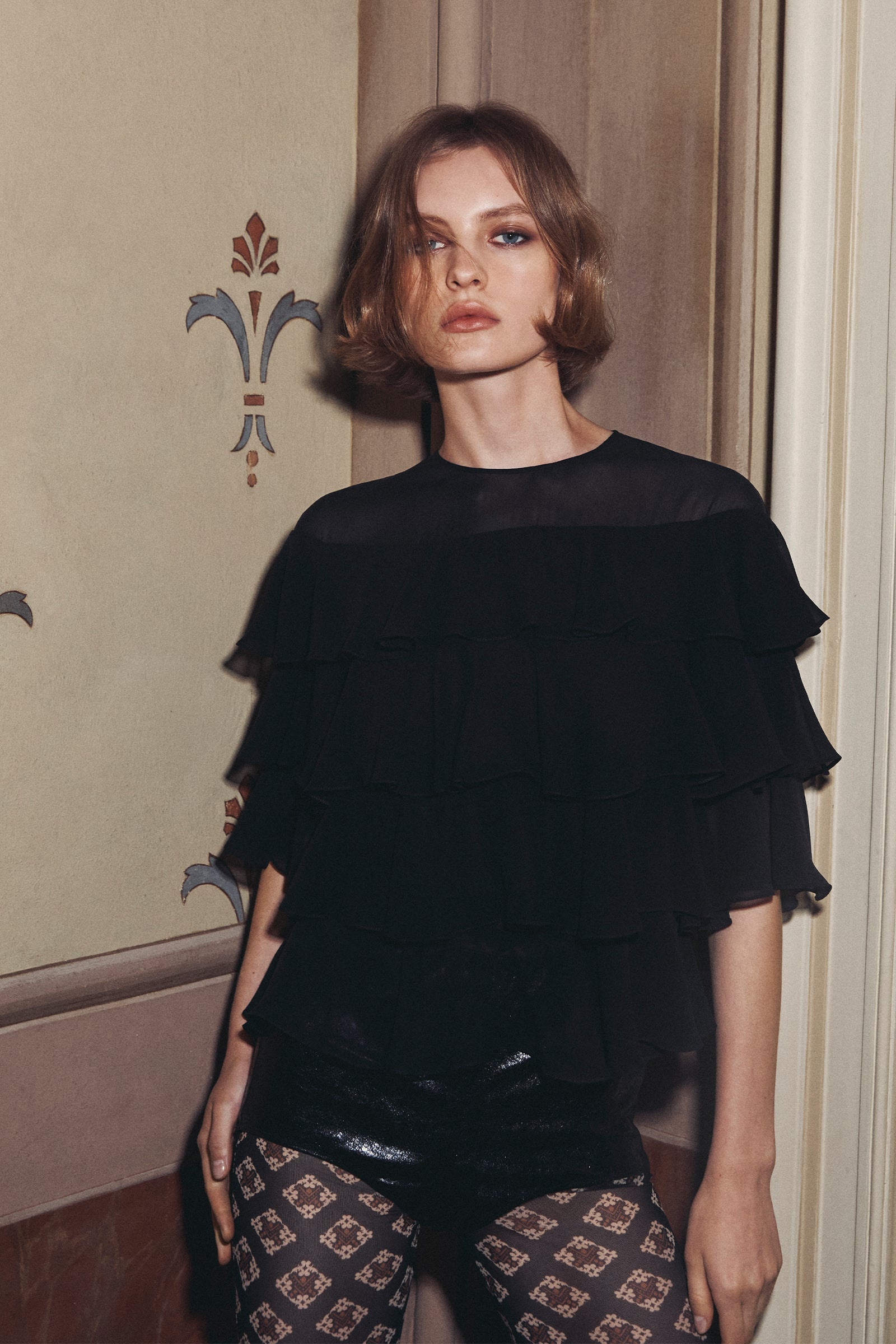 Sofisticata e sexy. Blusa multibalze in chiffon di seta con chiusura a goccia sul retro. Bottone gioiello a forma di fiore. Rendila rock con il pantalone BRIDGET.