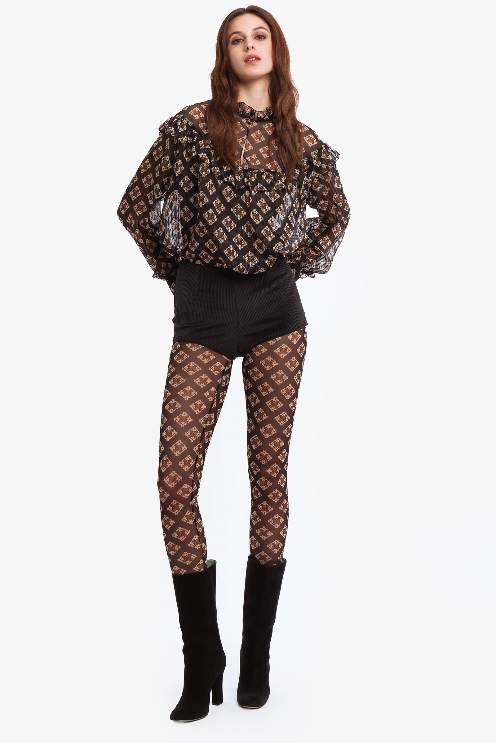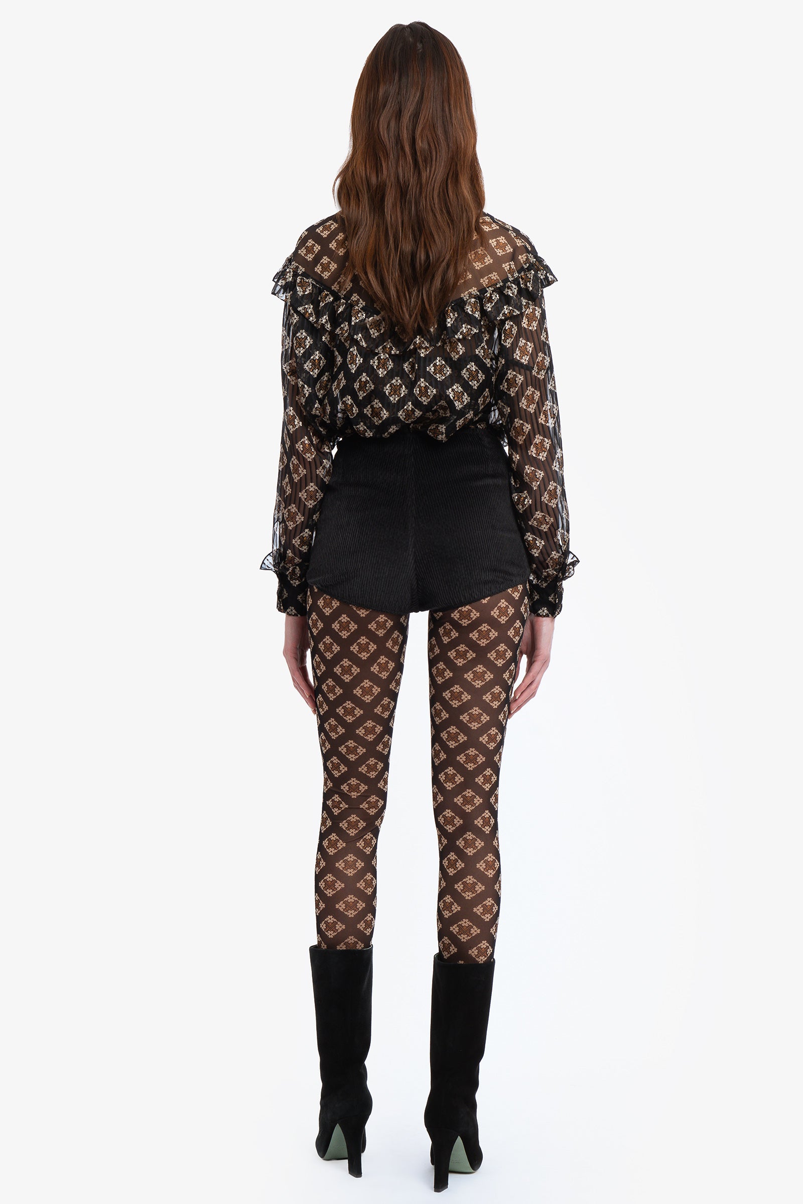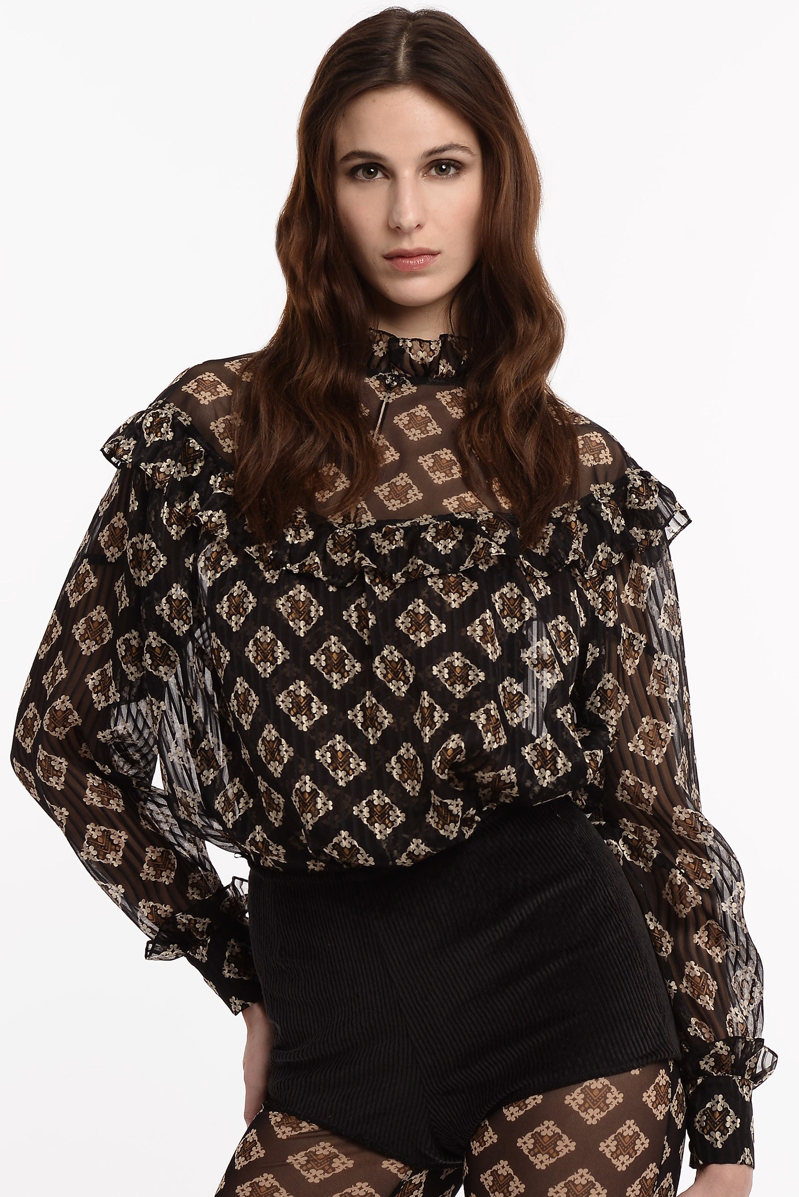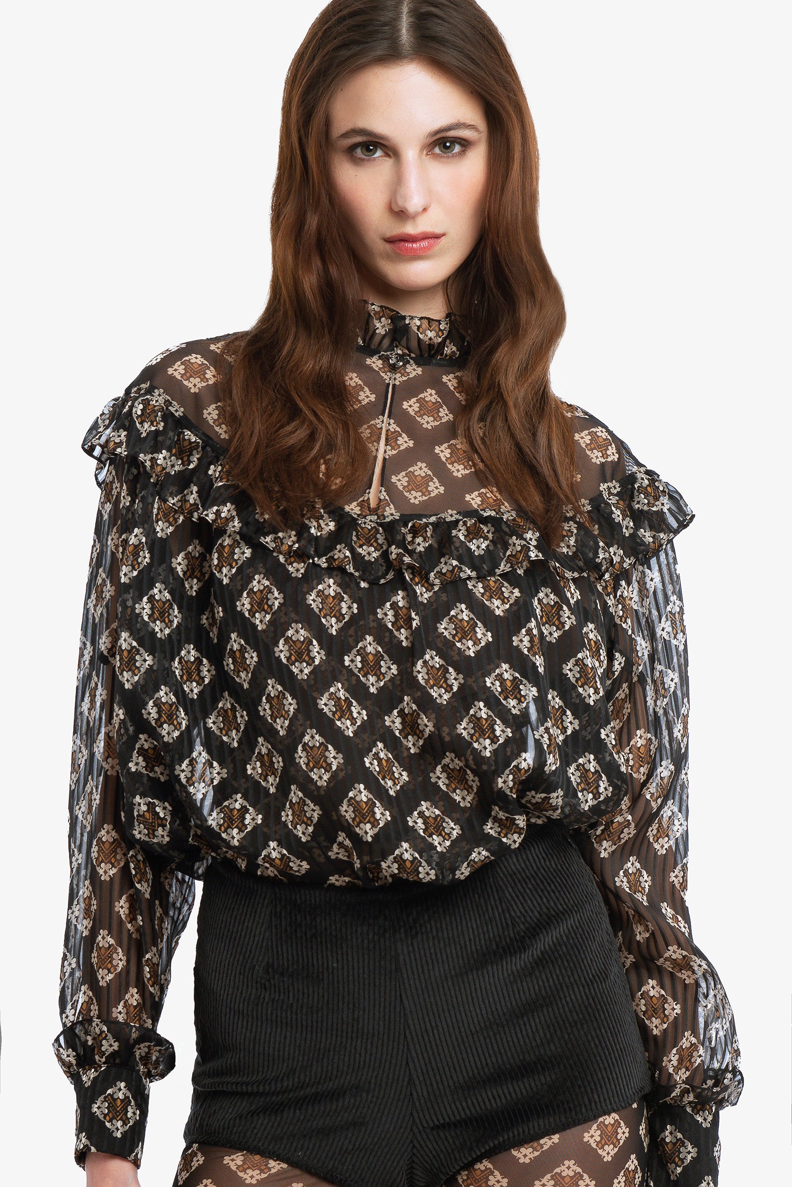 Bold, Chic, Decò. Blusa in seta e tulle, con apertura a goccia sul decolletè e profili a rouches. Bottoni rivestiti in tessuto. Sensuale indossata con gonna goffrata VIRGINIA.