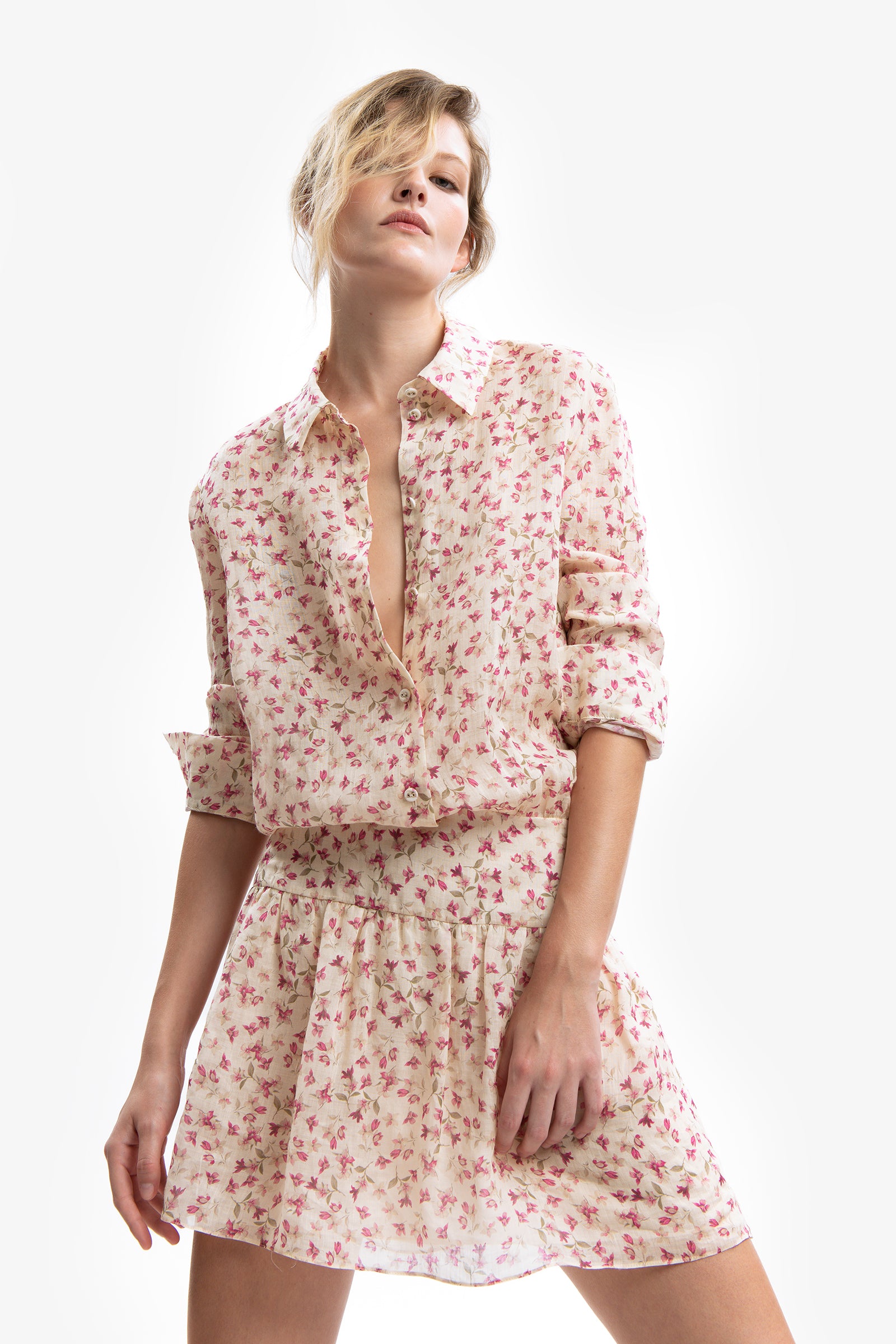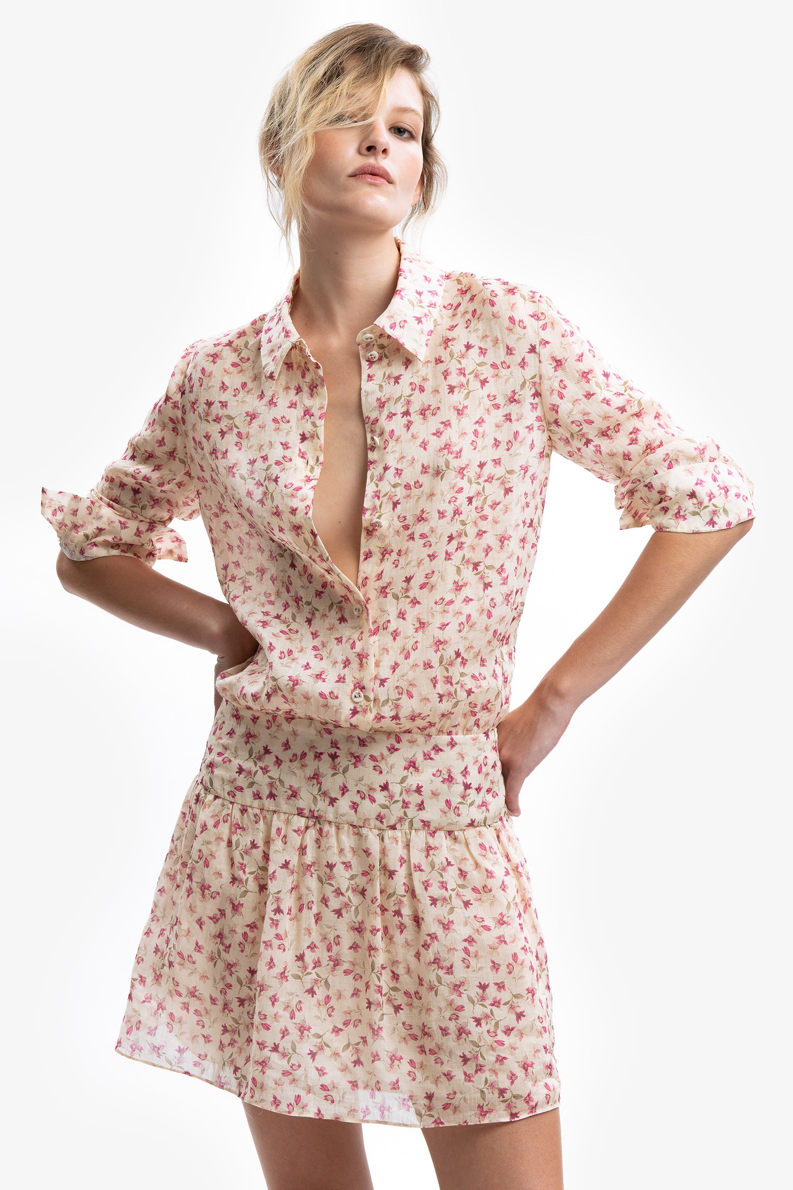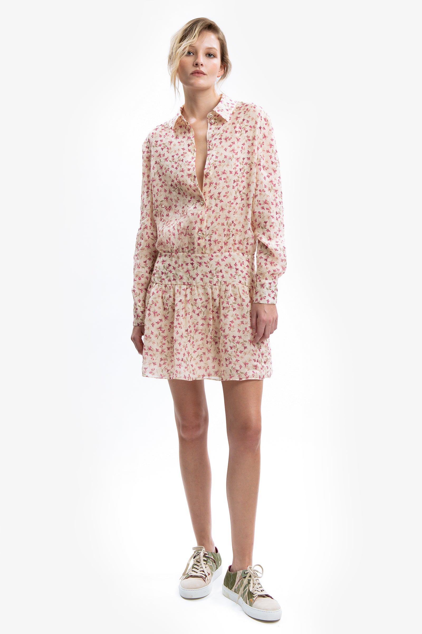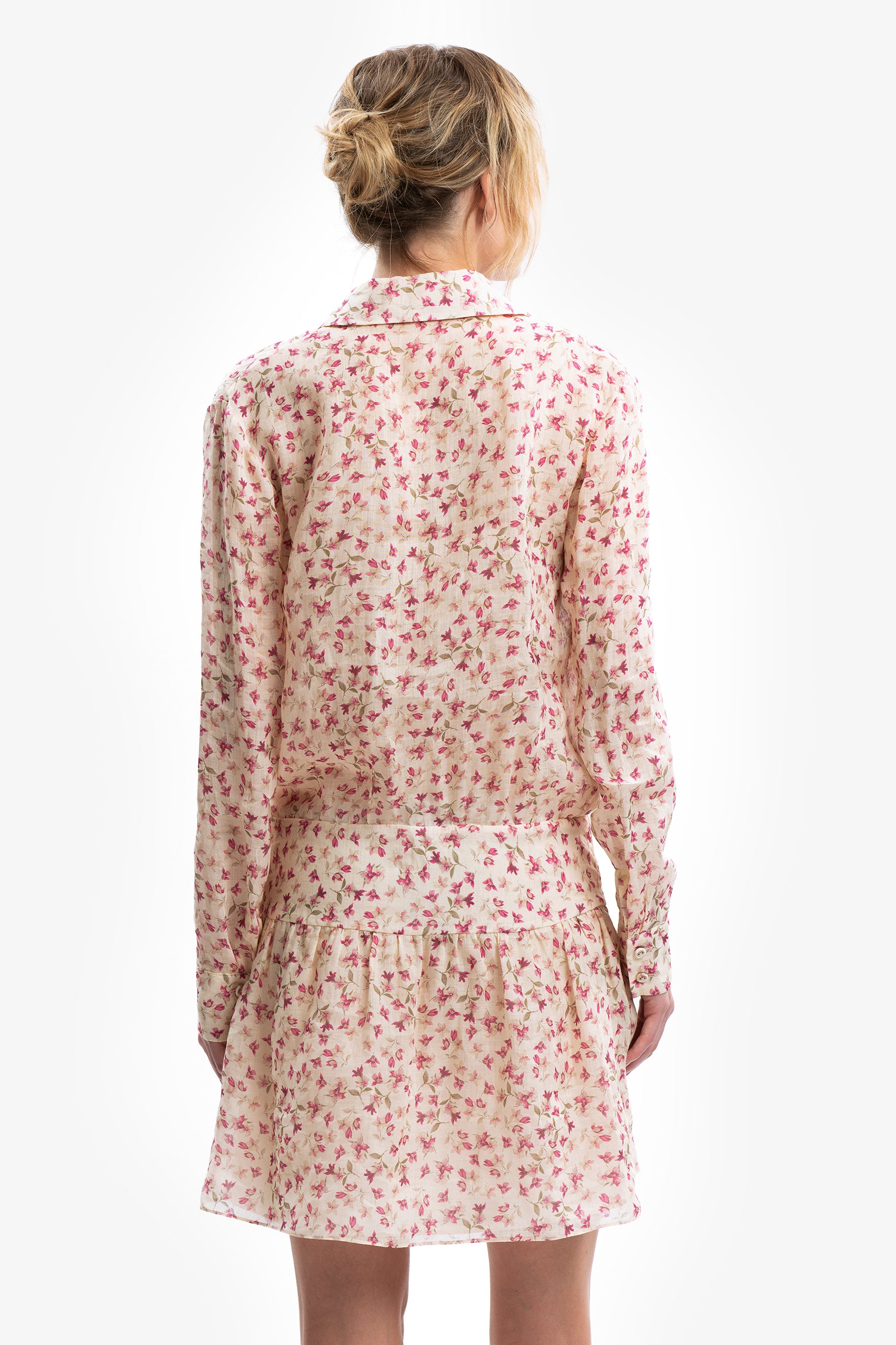 Soft Bloom in the city. Mini abito chemisier in ramiè a stampa floreale. Chiusura frontale con bottoni gioiello fino alla vita. Maniche lunghe con polsino. Vita con fascia e gonna ondulata.