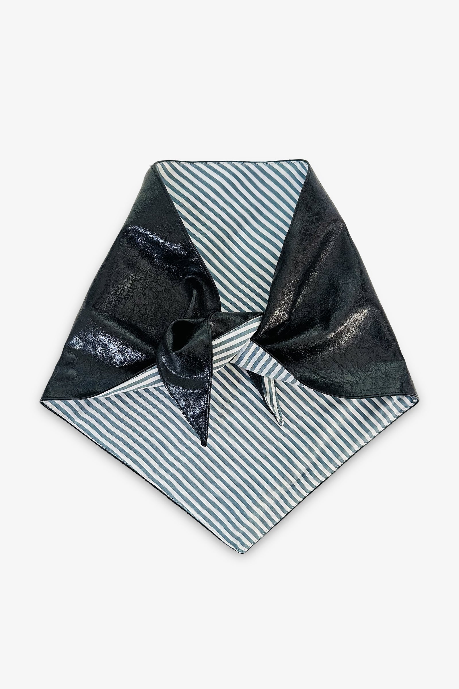 Al collo o annodato sulla nuca, il foulard bandana Double è realizzato in doppio tessuto seta e eco-pelle craquelè, e può essere indossato in entrambi i lati. Gioca ad abbinarlo con i tuoi outfit di giorno e di sera.