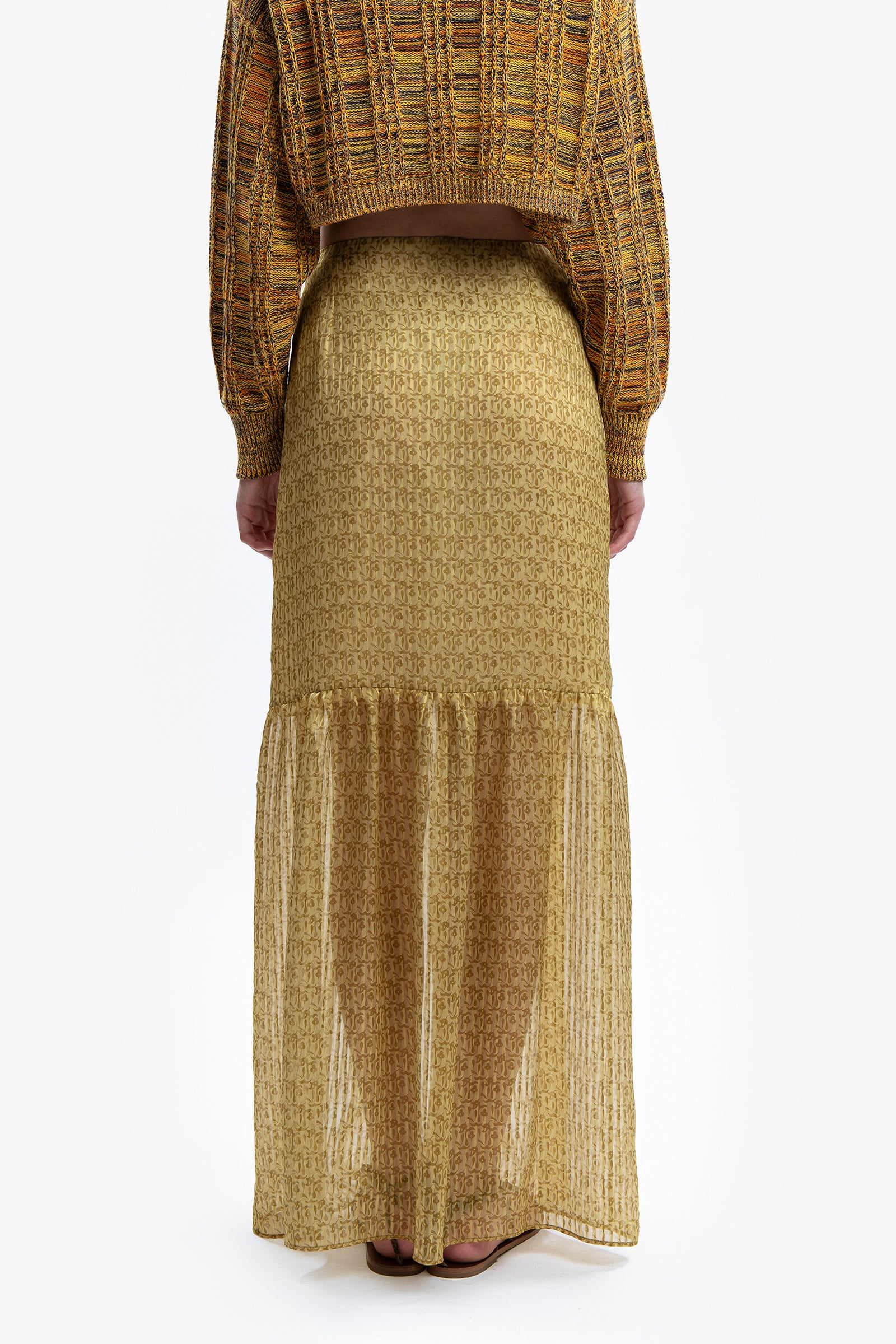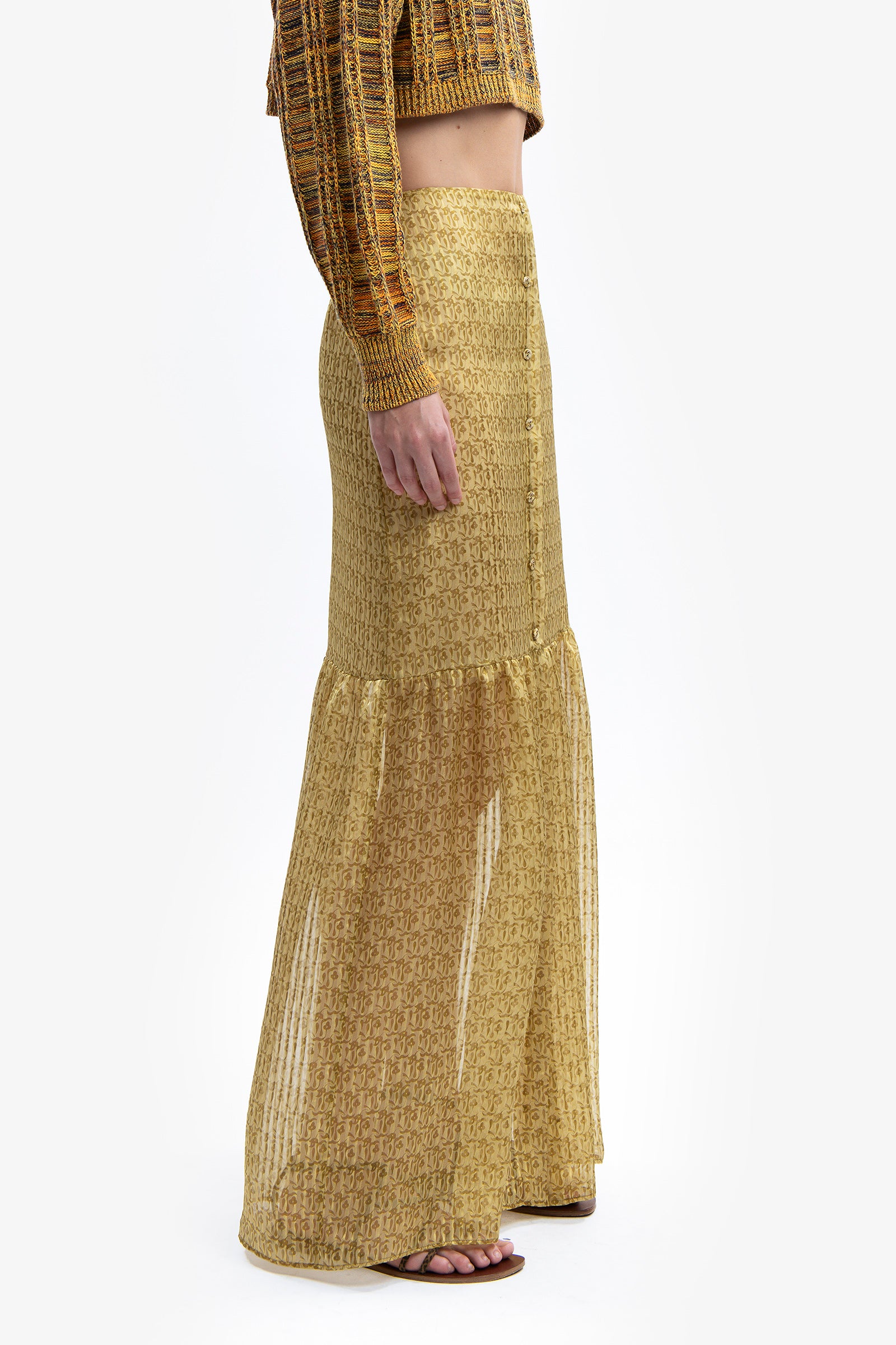 Lost in memories. Gonna lunga in seta striped jacquard in stampa floreale, vita regolare e abbottonatura centrale fino al ginocchio, con spacco che rivela le gambe e balza arricciata al fondo. Sorprendente abbinata alla maglia MELANIA.