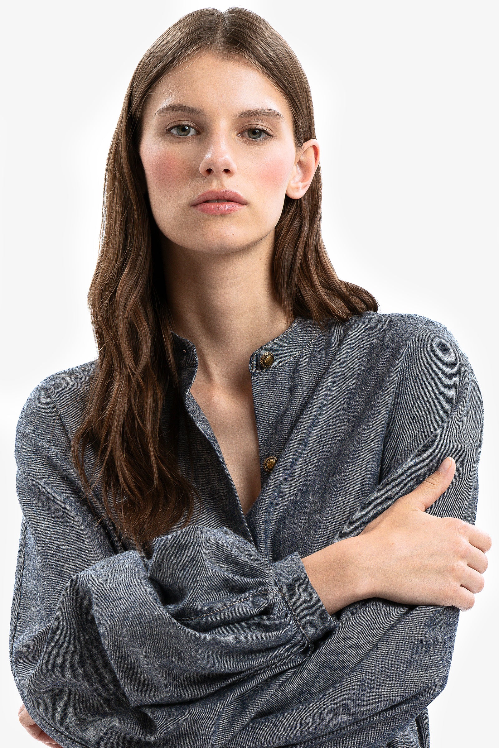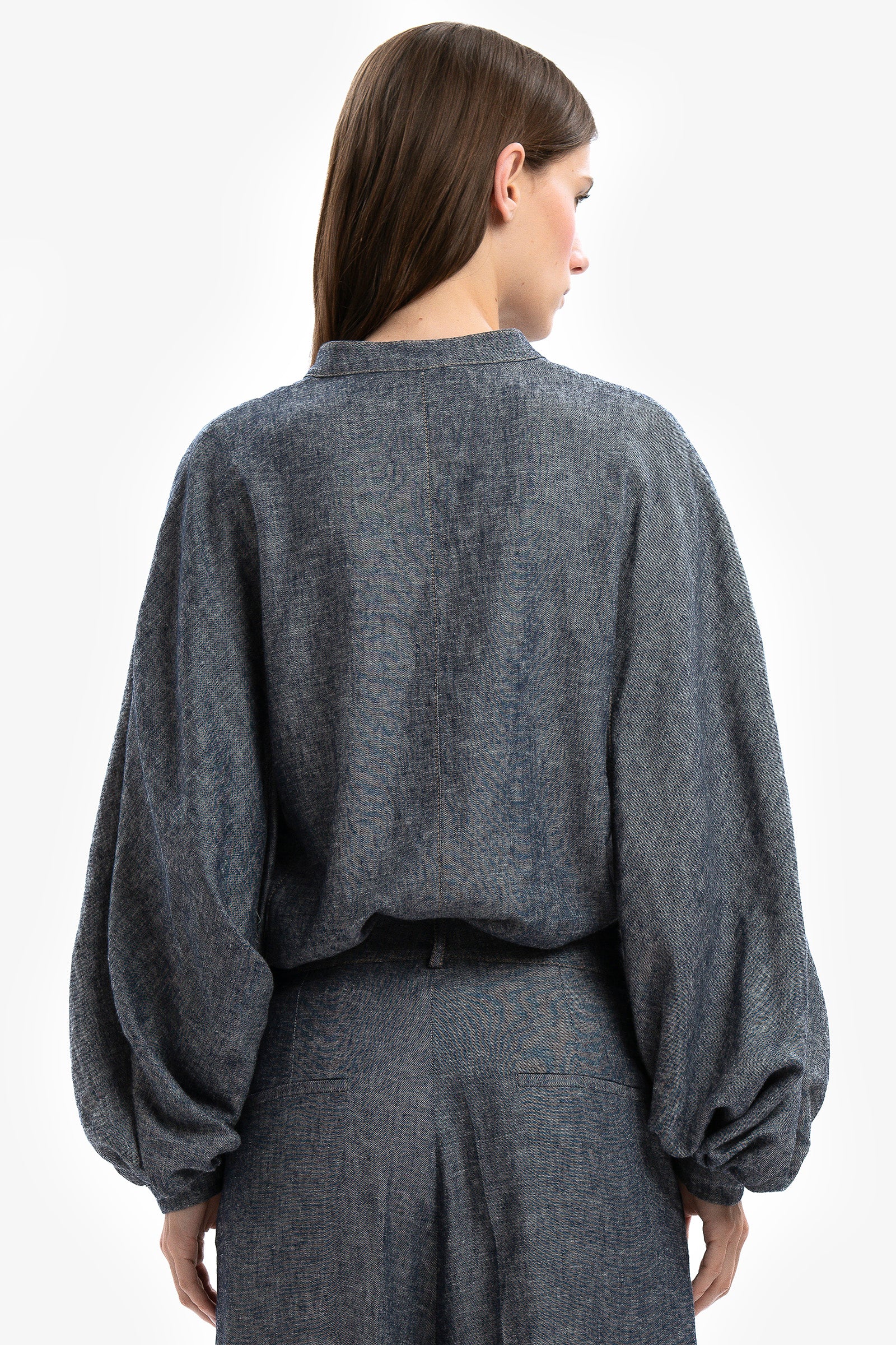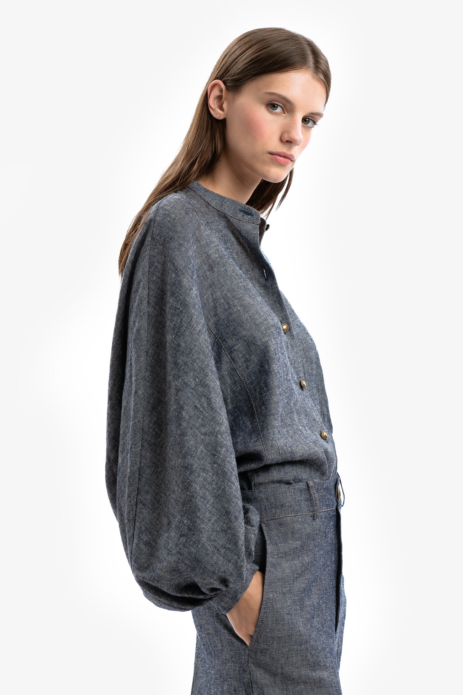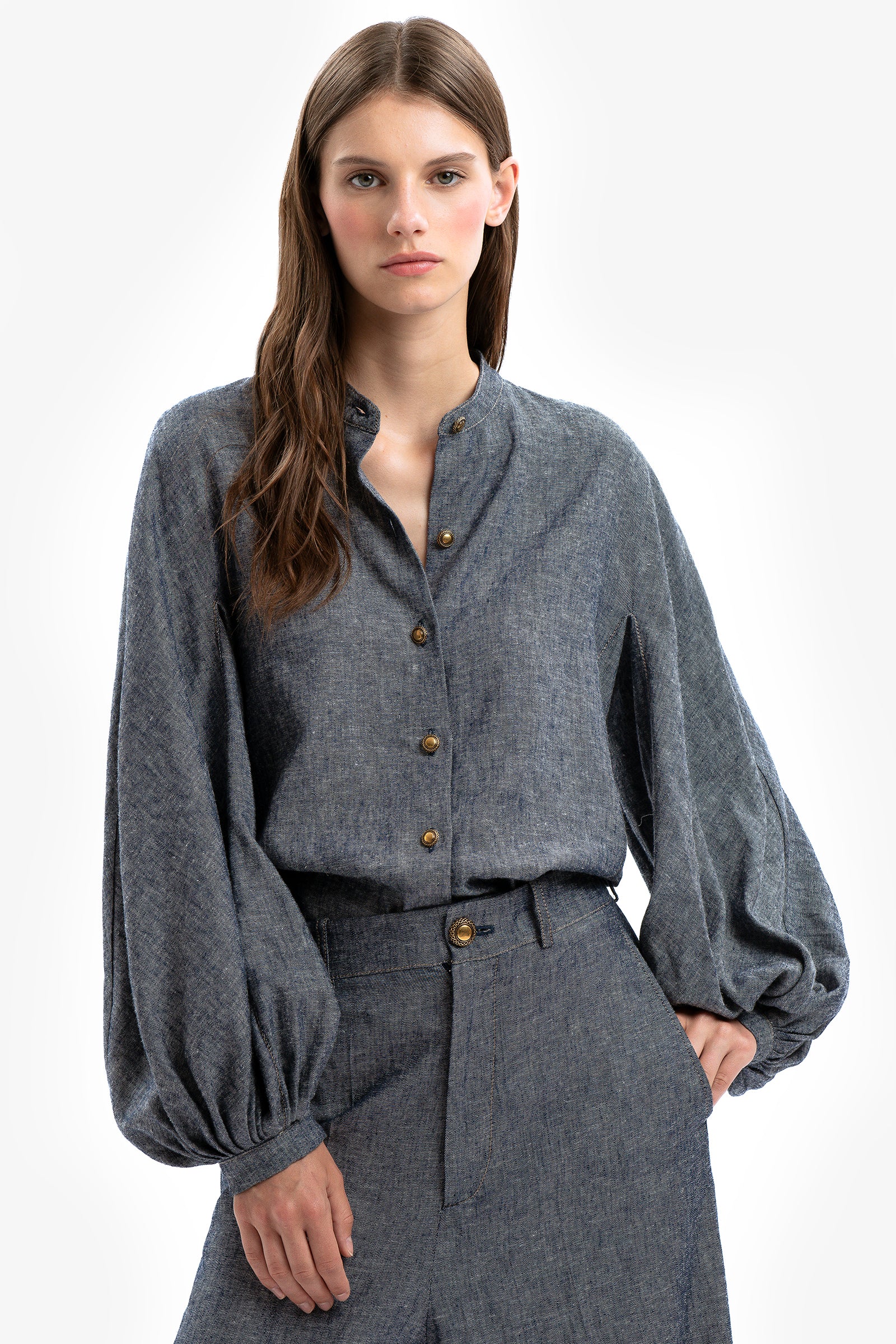 Sotto cieli urbani. Camicia in lino e viscosa effetto denim con maniche ampie e svasate e colletto alla coreana. Chiusura con bottoni gioiello. Impunture ruggine a contrasto.