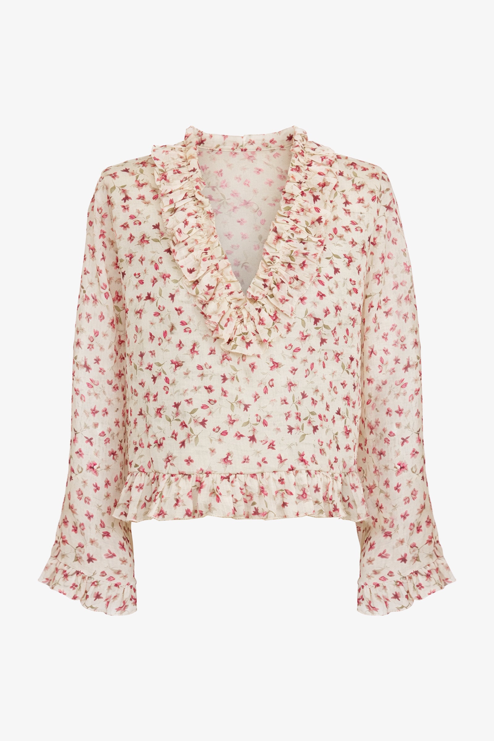 Soft Bloom in the city. Blusa crop in ramiè a stampa floreale, con maniche kimono e volant su scollo a V, orlo e maniche.