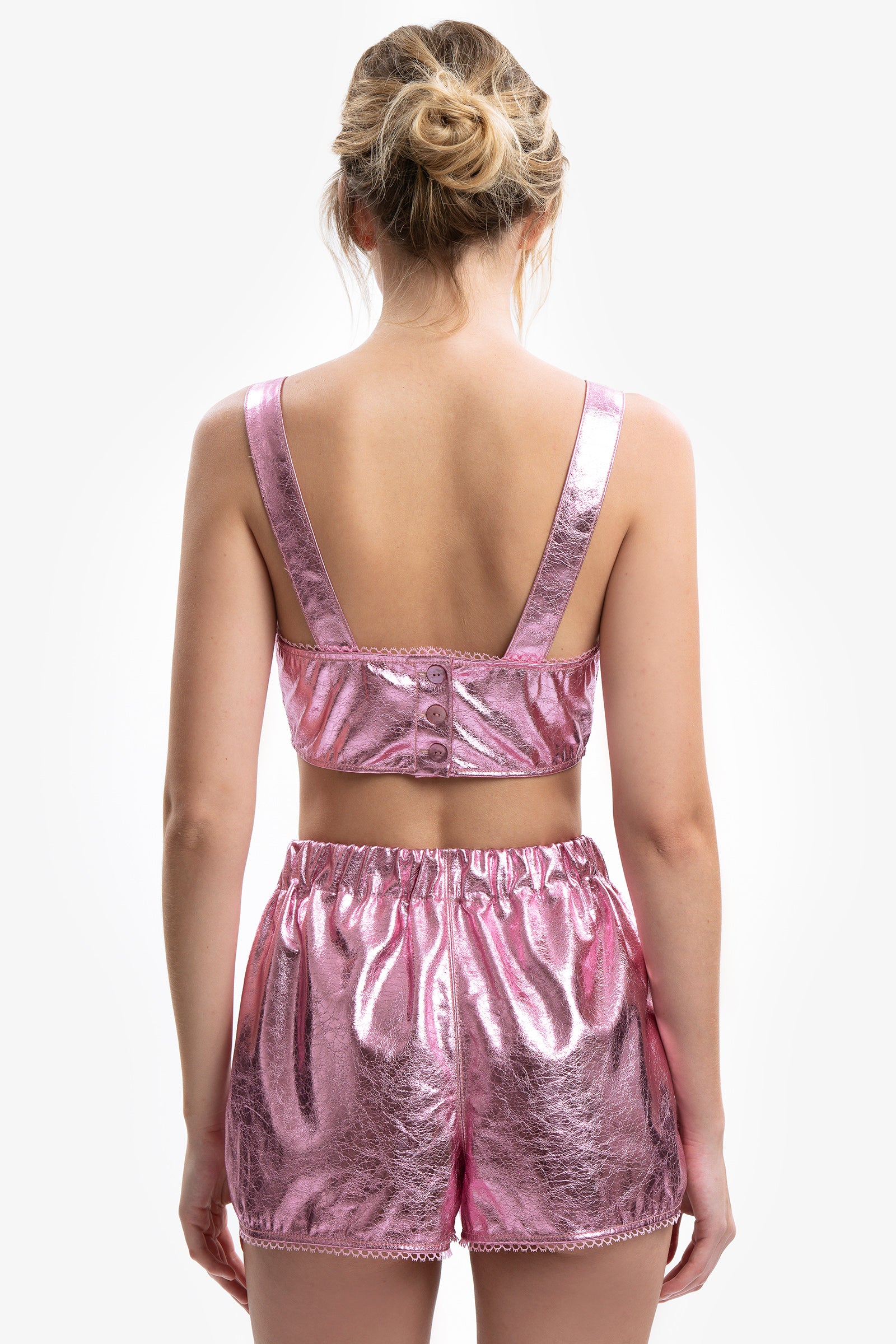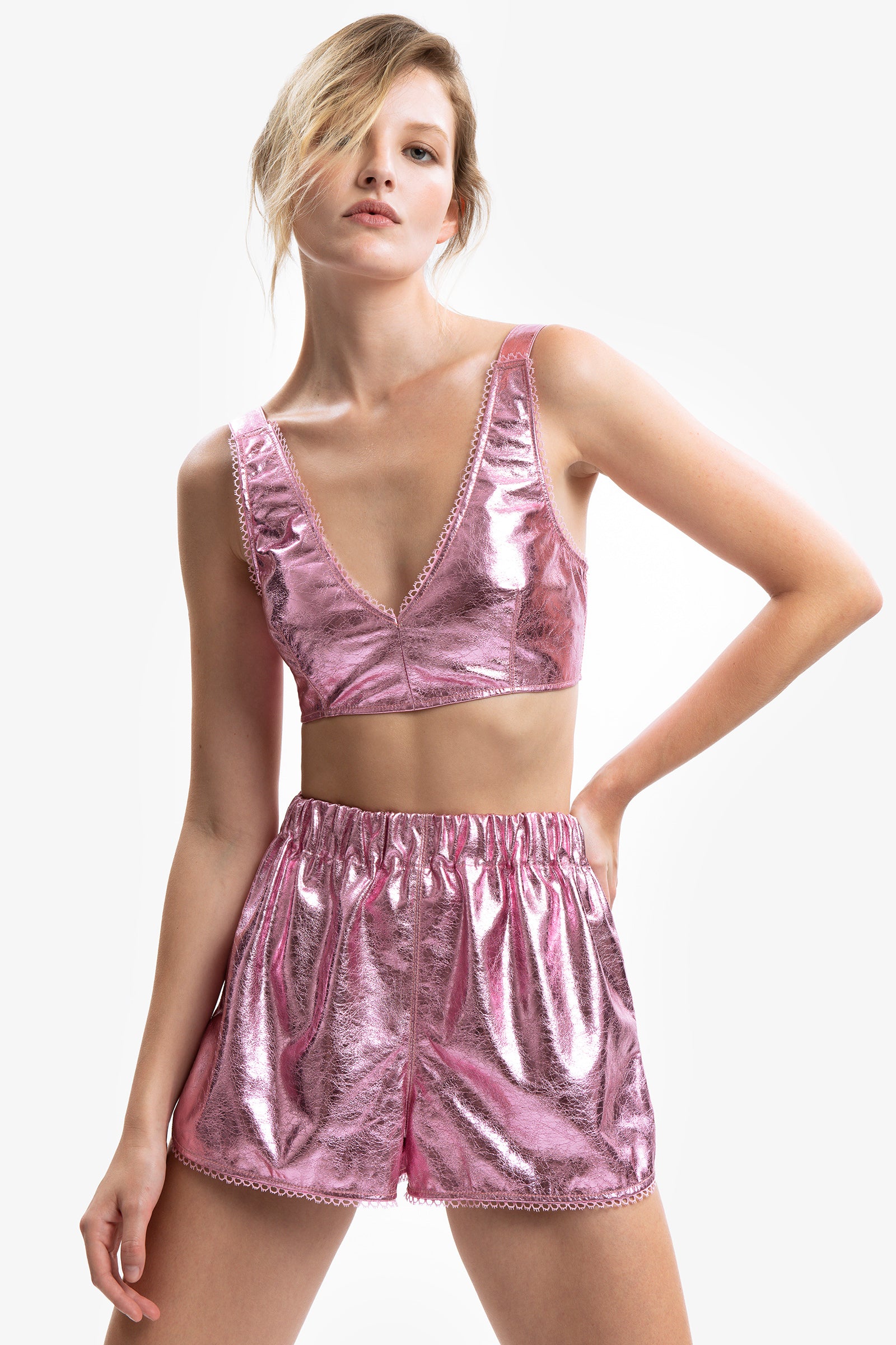 Shorts in laminato craquelé effetto metal a vita alta con cintura elasticizzata. Passamaneria applicata sui profili.