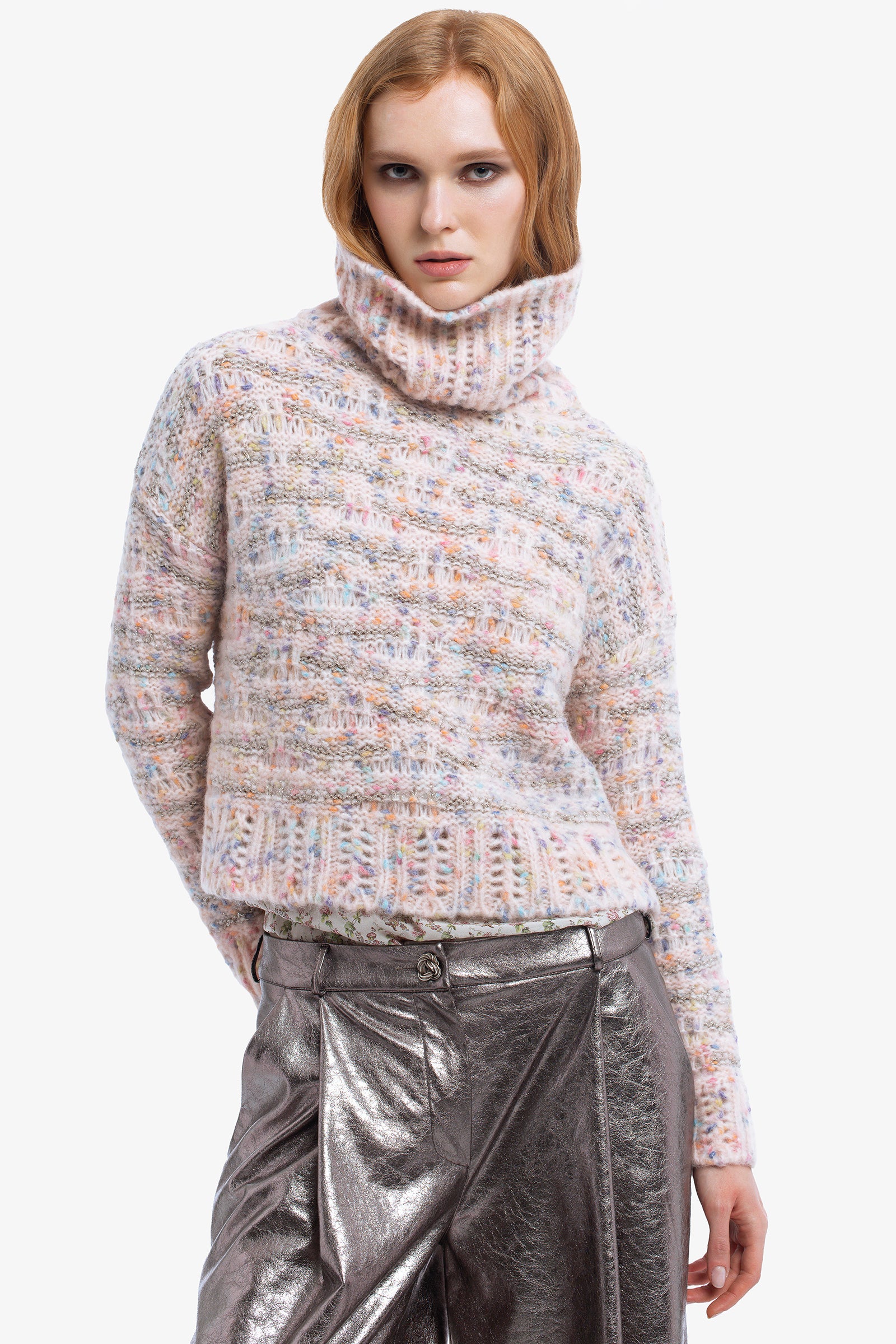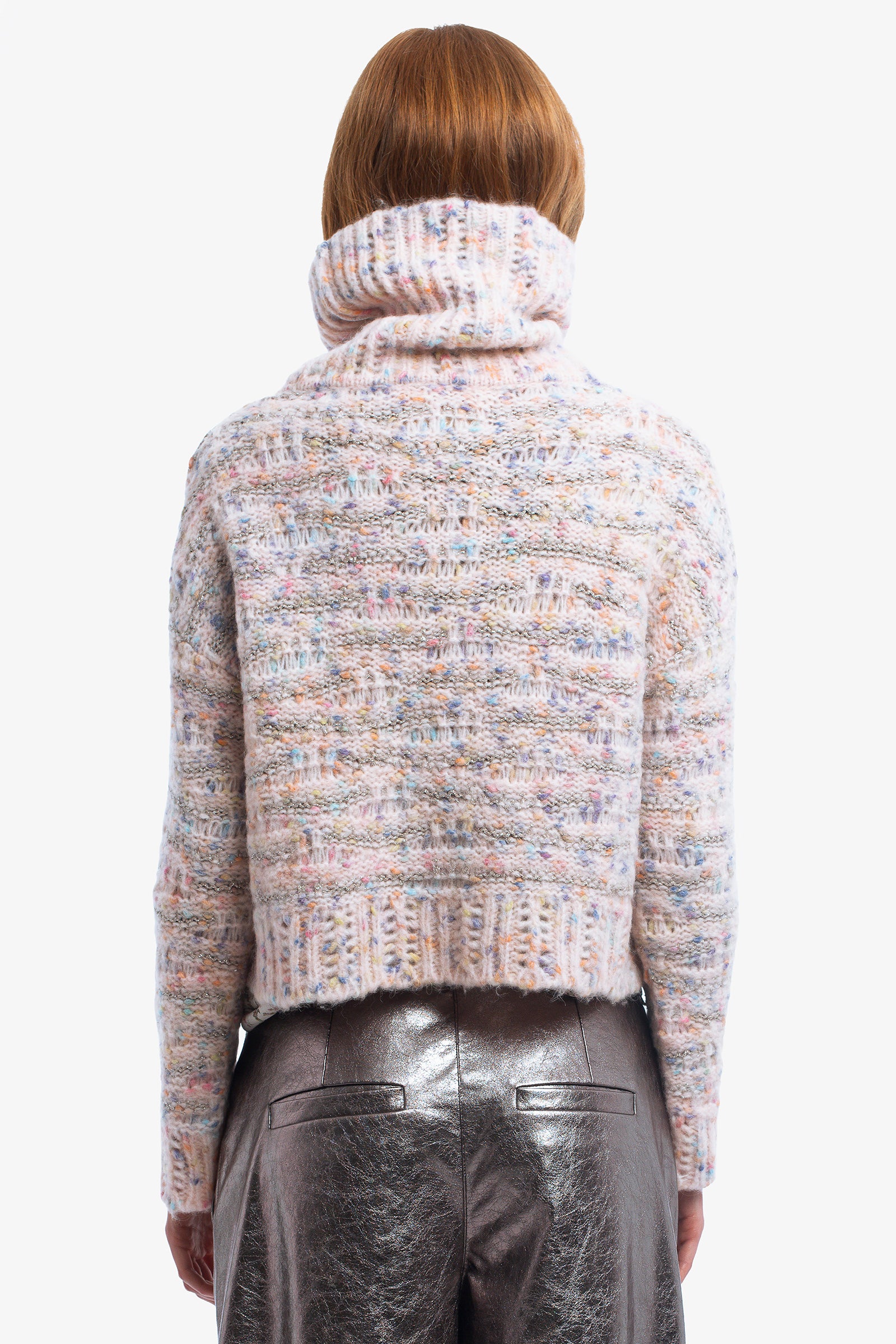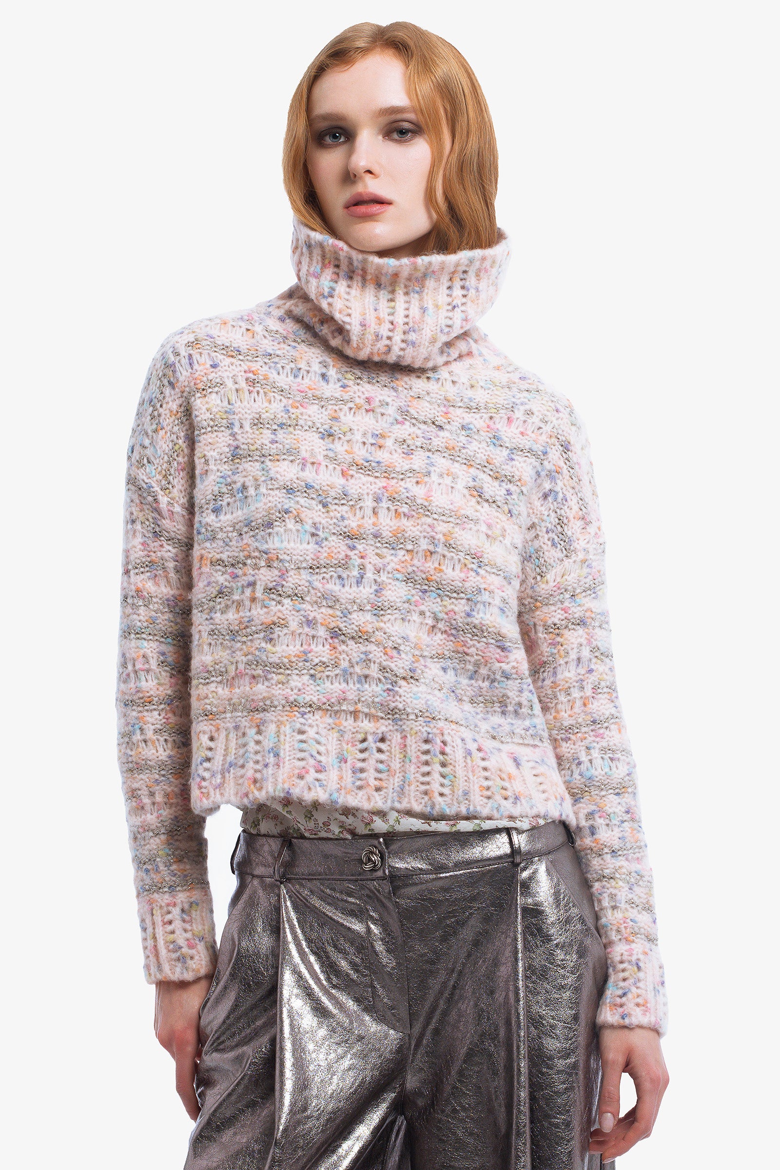 Just like a candy. Maglia crop a collo alto in alpaca e lana realizzato con pois multicolor effetto caramella e filo metal per un touch brillante. Rendilo rock con il pantalone ADELAIDE.