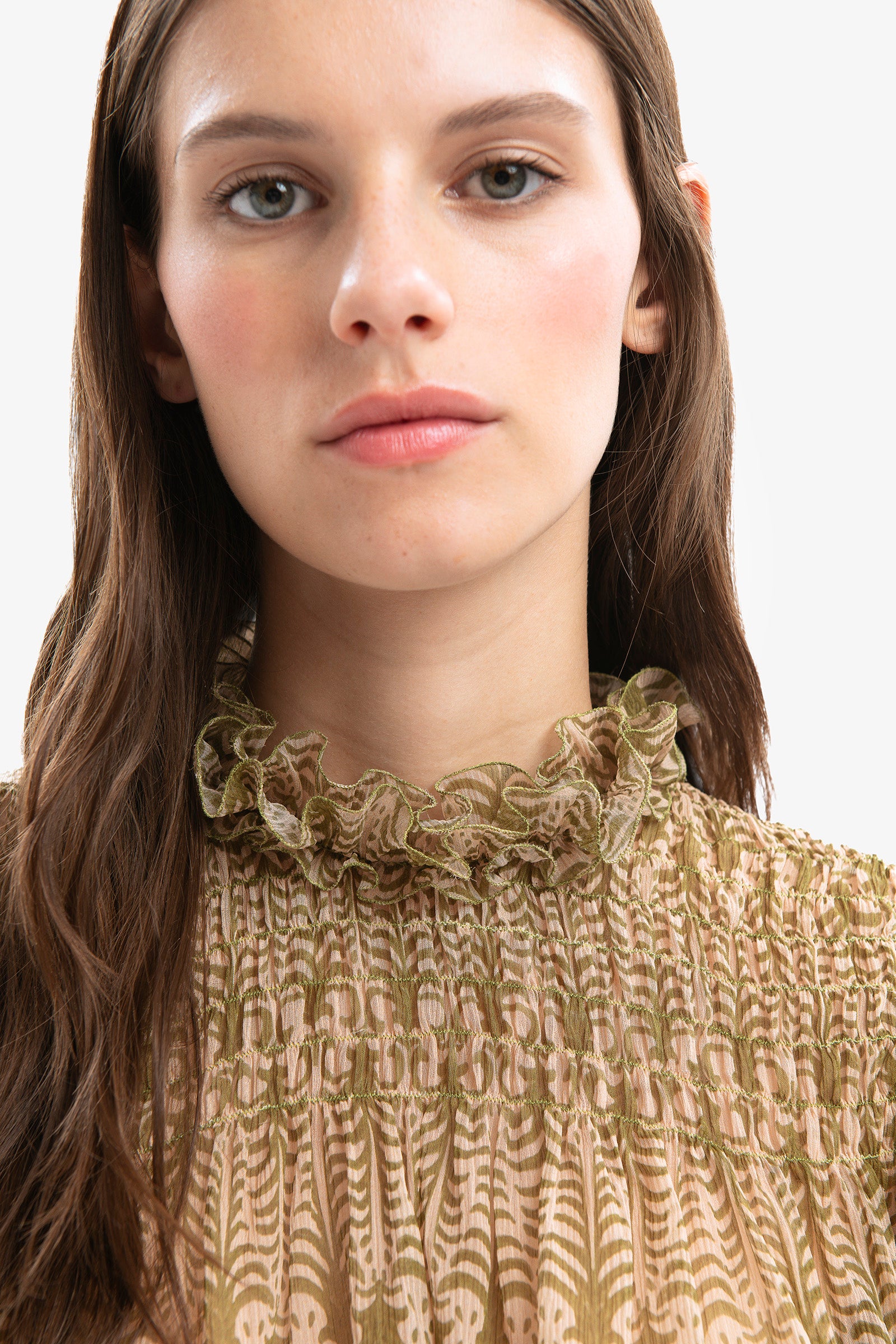 Blusa in seta con collo a listino arricciato. Punto smock sul davanti e maniche ampie.