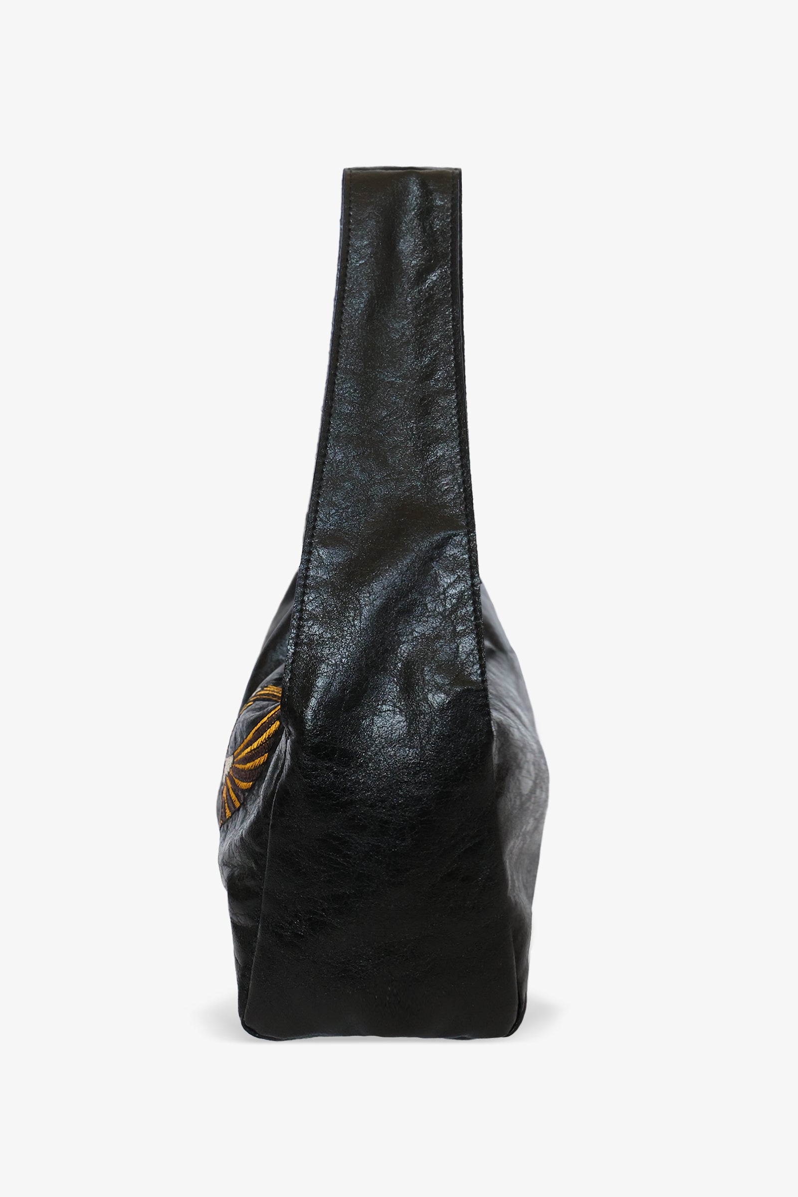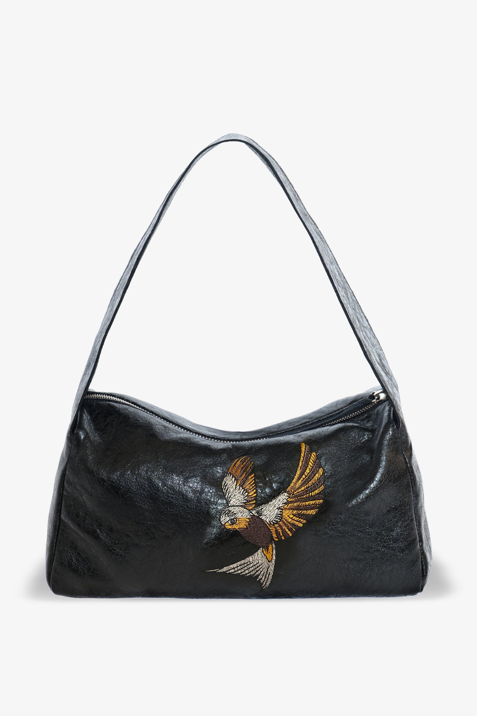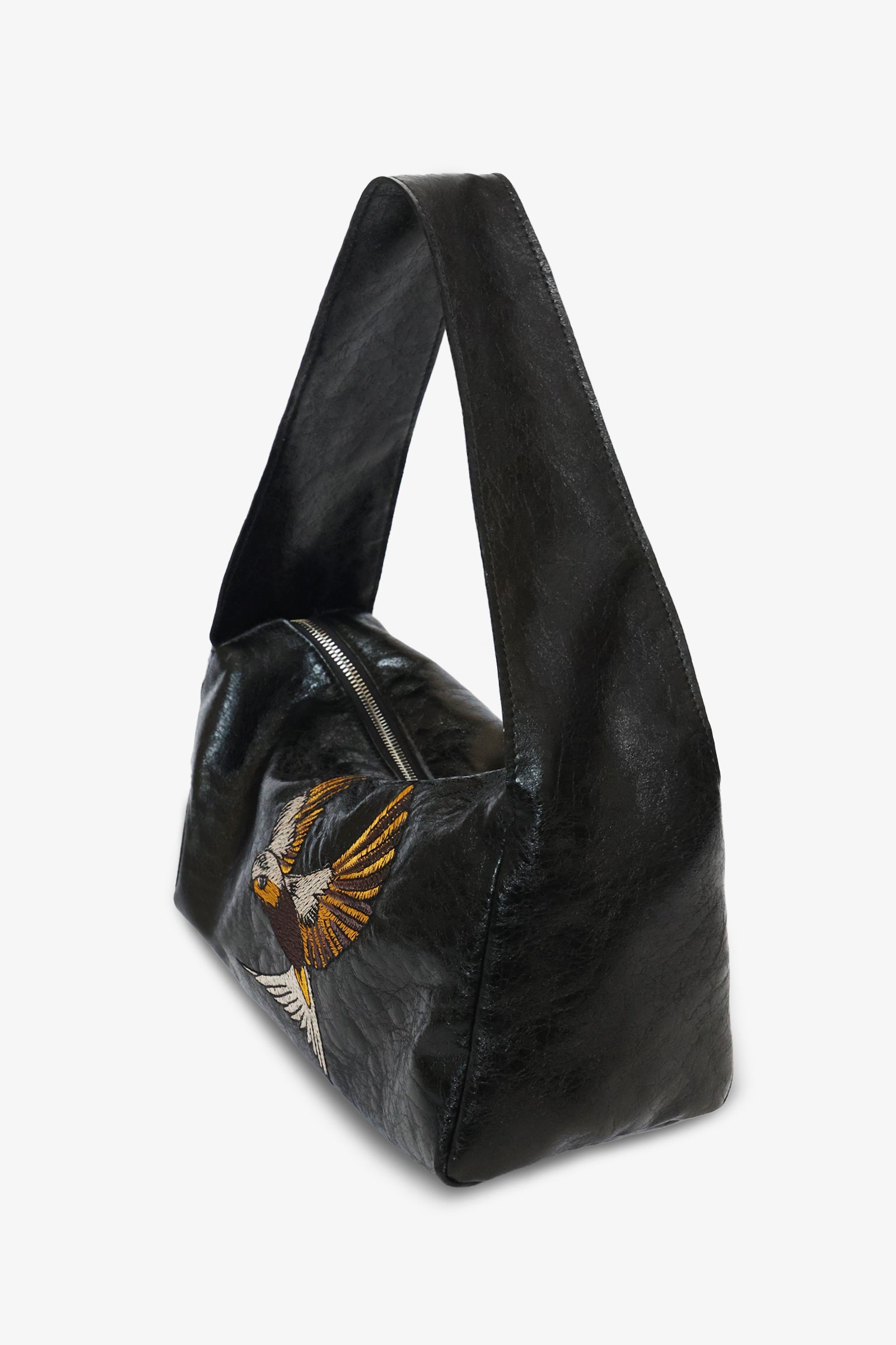 Just one. Kristina Ti presenta Numero Due, la borsa a spalla in eco-pelle black effetto craquelè, con ricamo Bird sul fronte, chiusura a zip e interno foderato in denim di cotone con due tasche.
